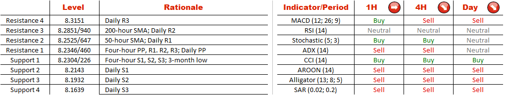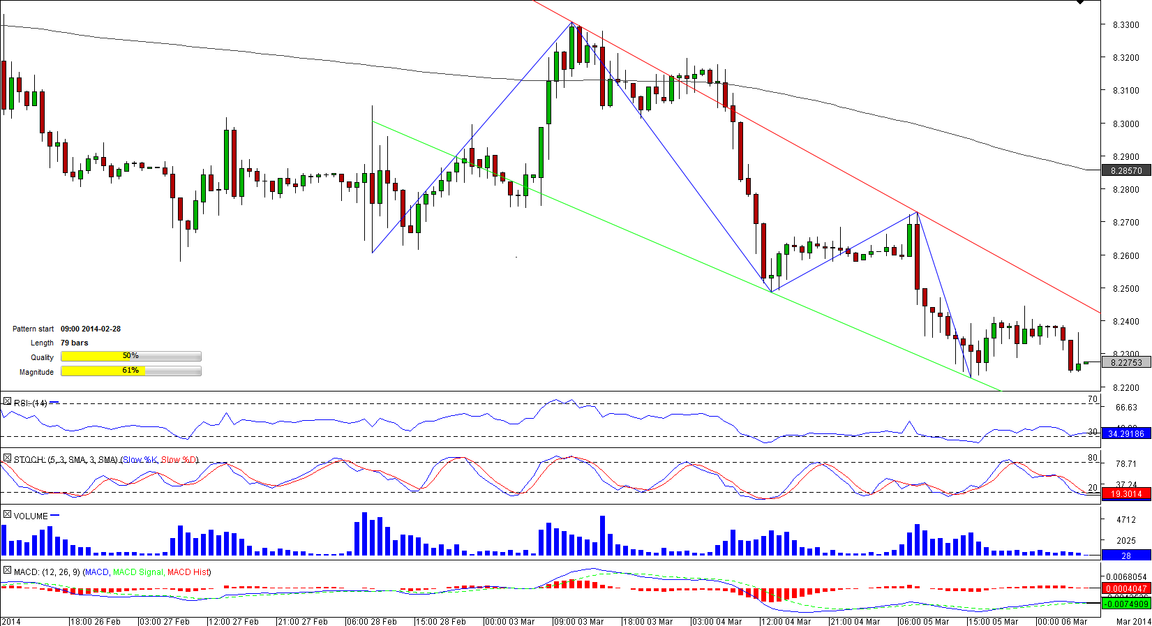Now the EUR/NOK is vacillating near a three-month low of 8.2228 and considering that downward-sloping pattern trend-lines are likely to continue pushing the pair down, the currency couple may dive below this mark in the foreseeable future. Technical data also points to a weakness in medium and long terms.
