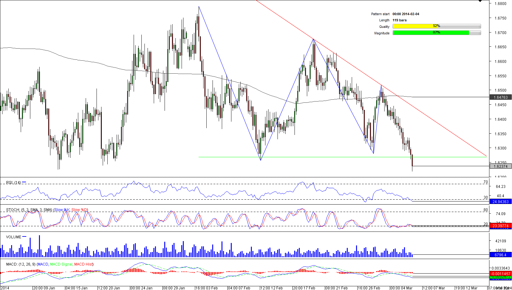 While against the U.S. Dollar the single currency has been appreciating since July, it has been moving sideways against the Kiwi even longer. It was not a surprise that the pair formed a descending triangle on a 4H chart that is likely to be completed soon. Keeping in mind that the outlook is bearish in 64% of the time and the fact bears are already trying to break through the lower boundary, the outlook is bearish. At the same time, vast majority (57%) of Dukascopy traders are holding long positions, expecting a bounce back. A move above pattern's support will make long traders focus on 1.6295, while a close below 1.6267 will suggest bears' intentions to reach a weekly S2 at 1.6113.