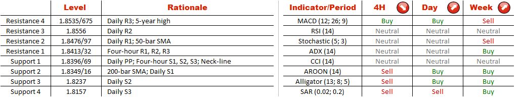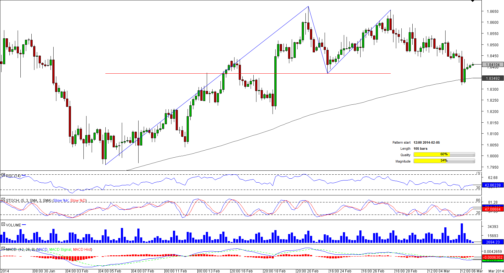 Now the formation represents a particular interest since the pair is on the verge of breaching the neck-line at 1.8369. In case this level is penetrated before long, the currency couple is likely to reach the 200-bar SMA at 1.8349, below which a long-term slump may be in place.