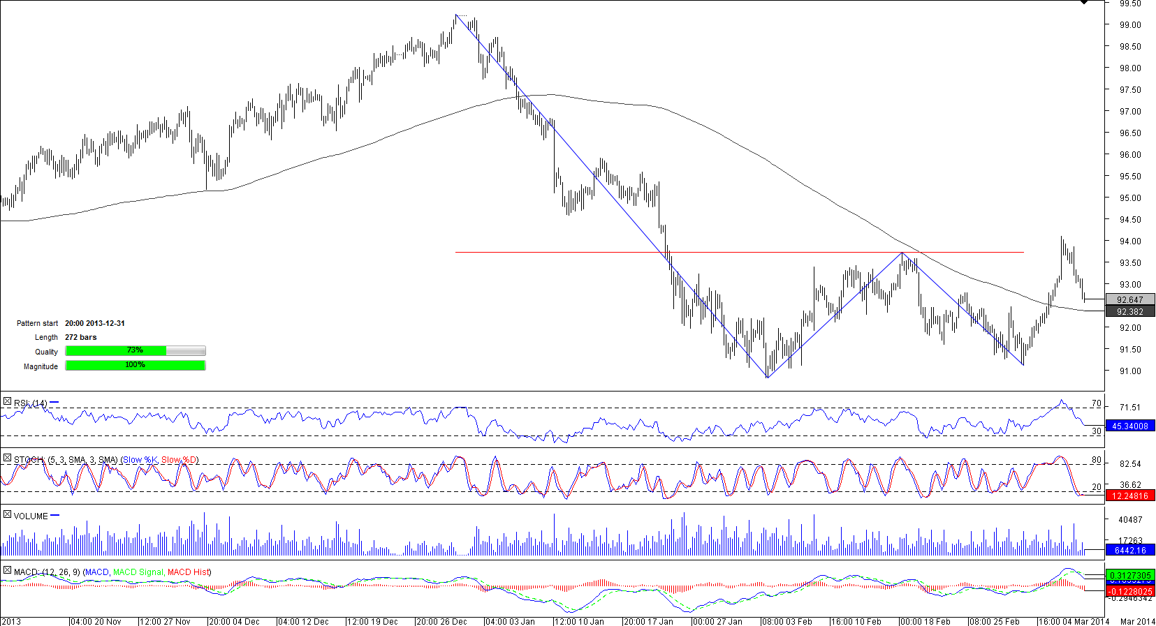 Currently the pair is moving down after an unsuccessful attempt to penetrate the neck-line at 93.73, which represents the chief hindrance for a rally usually seen after a breakout of the double bottom pattern. Meanwhile, about two thirds of traders are bearish, meaning that the breakout is not likely to occur in the hours to come.