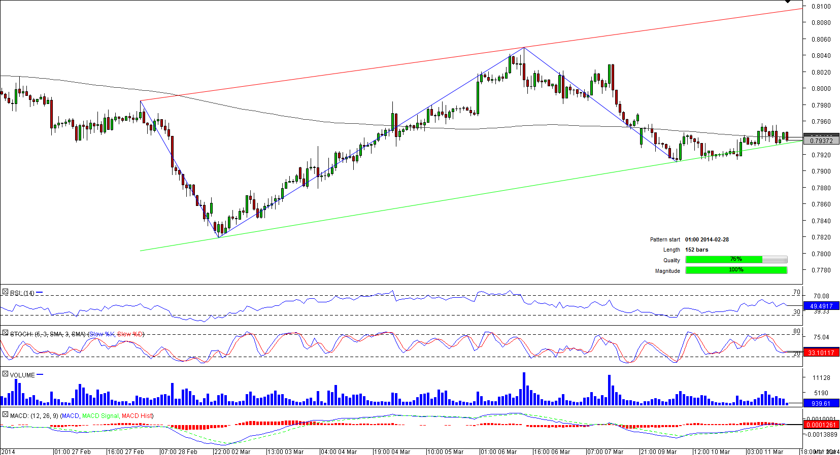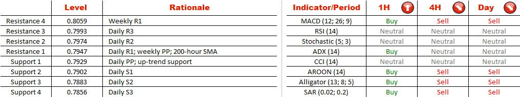 There is still scant evidence of AUD/CHF trading within the boundaries of the bullish channel, since both trend-lines forming it were respected by the market only on several occasions. However, if the near-term technical indicators turn out to be correct and the currency pair breaches the resistance near 0.7950, there will be a good opportunity for the Aussie to re-test a previous high at 0.8060 and then reach the rising resistance line at 0.81. This would confirm validity of the assumption that AUD/CHF is forming a channel up pattern and is soon going to leave the vicinity of the up-trend support line at 0.7930. Meanwhile, the sentiment is strongly bullish—68% of positions are long.