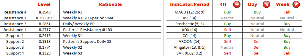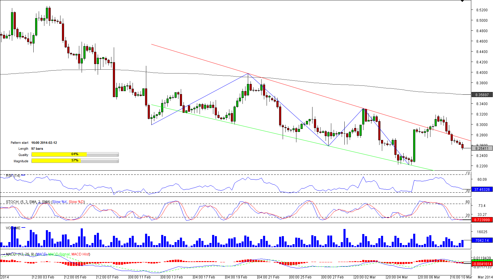 The EUR/NOK currency pair has been strongly bearish February 4, when the pair refused moving above 8.5274. Since then the pair has lost more than 3,000 pips already, and according to 74% of Dukascopy traders, the tendency will persist. Even so, bulls made an attempt last week, with the price being pushed higher by ECB's comments. The rally, however, was short-lived, and the pair moved back in pattern's boundaries. Moreover, a breakout was not confirmed by a spike in trading volume, hence, the outlook is still bearish. A dip below recent low and Daily S2 at 8.2263 will put pattern's support and daily S3 at 8.1918 on the map.