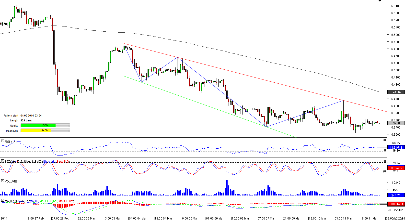 A sharp decline performed by USD/SEK in second part of February has led to a formation of the broadening falling wedge pattern that is around 130-bar long now. Recently, the currency couple has bounced off a six-month low of 6.3617 and now it is likely to target the 50-hour SMA at 6.3792. Market sentiment also props up this idea, with almost 86% of traders being bullish on the pair. If USD/SEK breaches its short-term SMA it will move up to the daily pivot point at 6.3816 above which there is only the level of 6.3837/78 (H4 R2, R3) that may prevent the pair from attaining the pattern's upper boundary and attempting to break out of the tunnel.