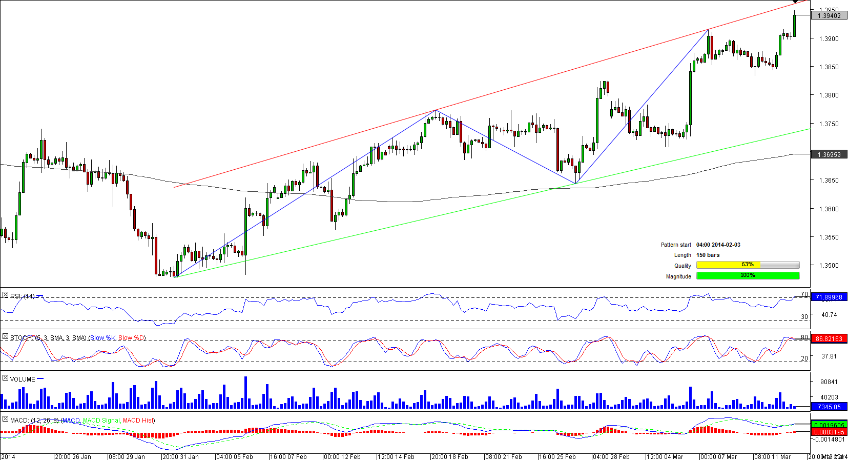 Now the currency couple is trading at a three-year high of 1.3948 and considering that it has already breached the daily resistance at 1.3930 that acted as the last defence against a rally towards the pattern's upper limit, the likelihood of a bullish breakout is relatively high. This is further bolstered by the market sentiment-62% of positions are long.