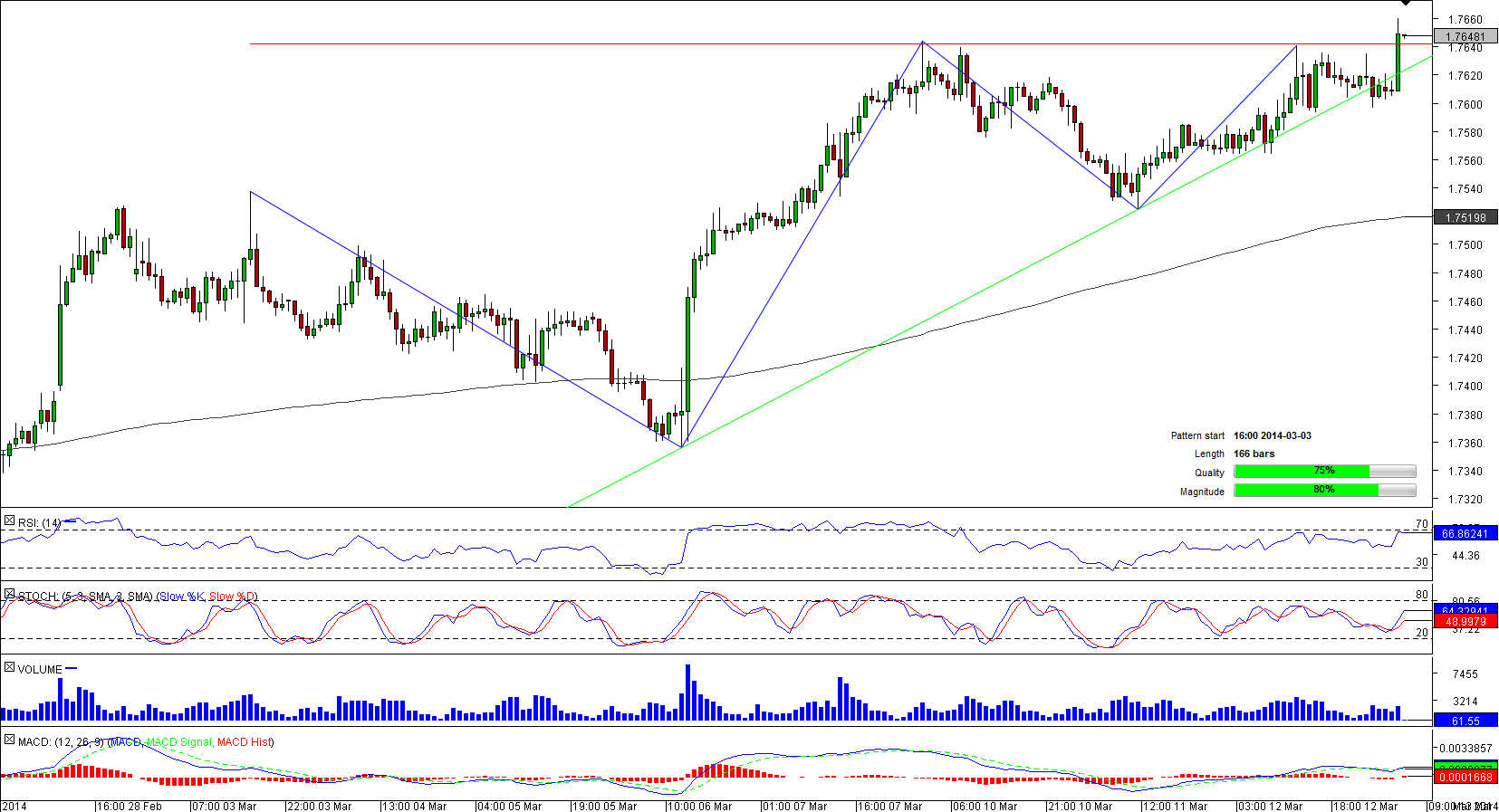 After EUR/SGD hit a two-month low of 1.7099 early February, it got an impetus for a climb and in the first days of spring it started to shape an ascending triangle pattern of high quality and magnitude that now is 166-bar long.