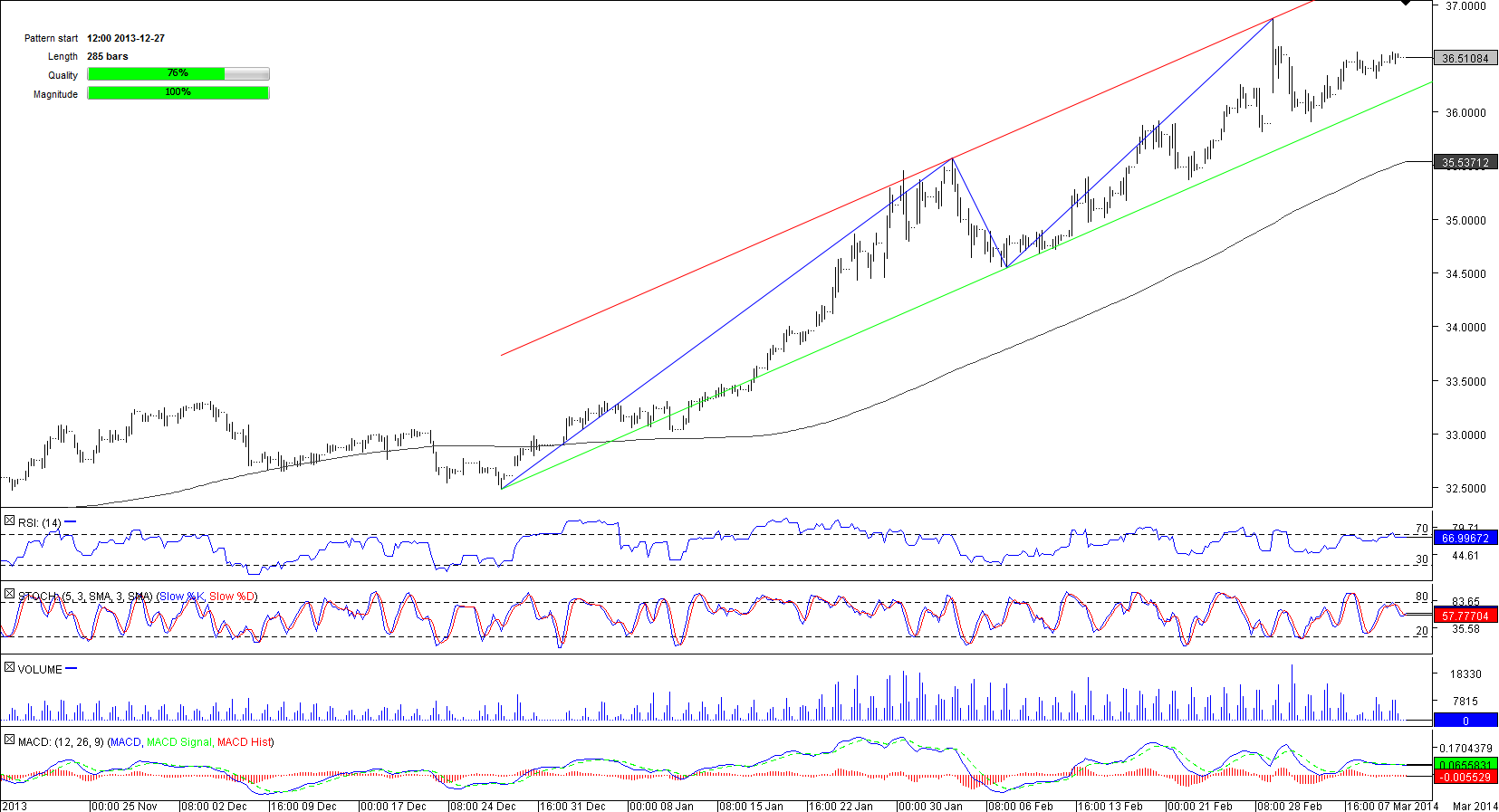 In the second part of February when tensions between Russia and western powers started to escalate amid confrontation in Ukraine, a sharp appreciation of the U.S. Dollar against the Russian Ruble started and helped the pair to form a channel up pattern, within which it is vacillating at the moment. The tunnel is relatively steep and has recently sent the currency pair to the highest level since at least 2009 of 36.8579. However, at the moment of writing, USD/RUB was in the downtrend, paring gains after a jump to the recent high. According to the SWFX data, the decline may continue in the hours to come as circa 52% of market players hold short positions.