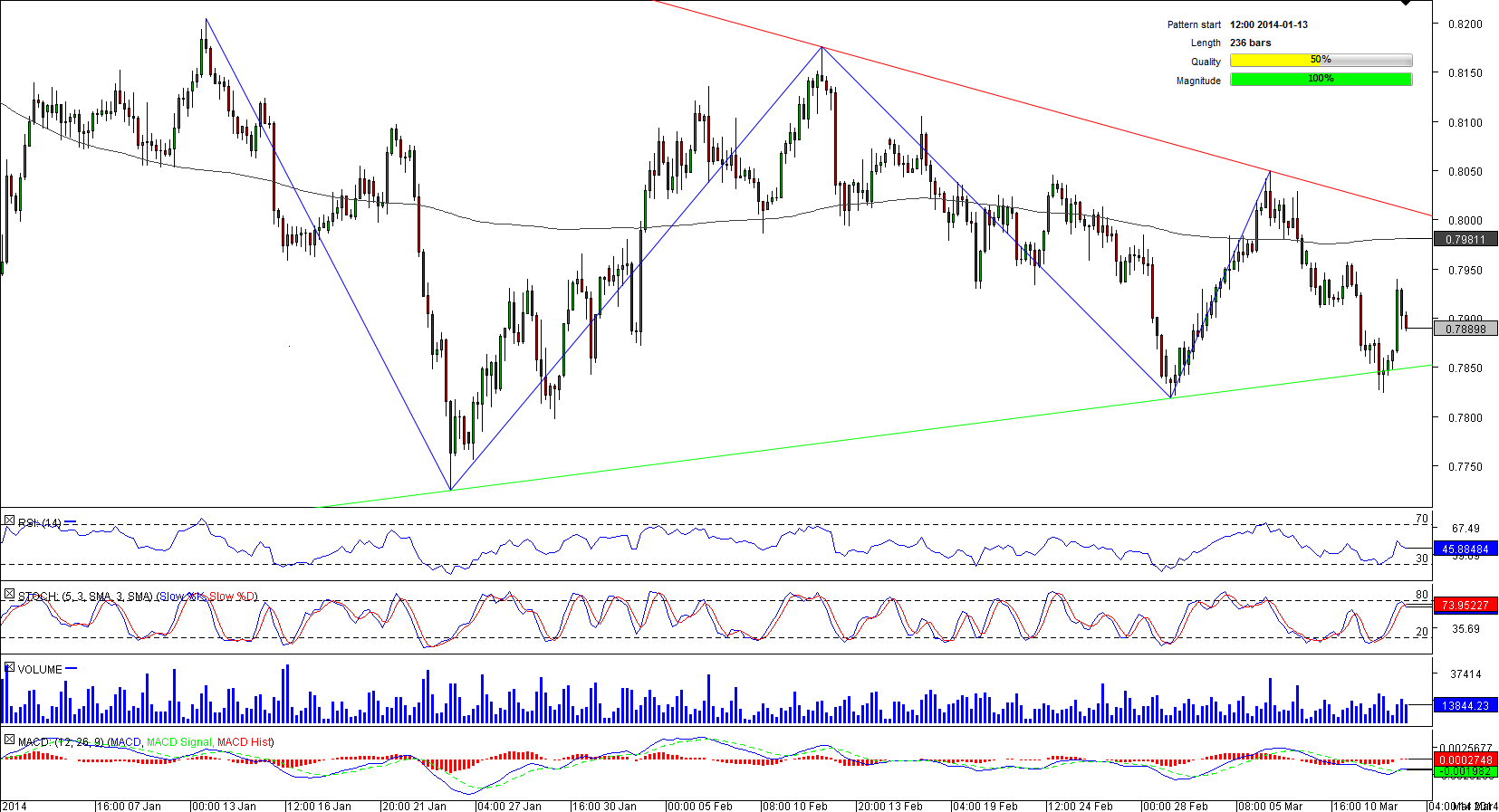 At the end of the last year AUD/CHF refused to follow the bearish tendency, which originated back in the spring of 2013. A month later the currency pair tried to recover, but eventually the bullish momentum subsided, leaving us with a symmetrical triangle.