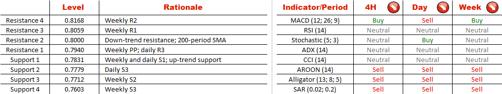 A similar formation was developing between last year's August and November and in the end it did not manage to change the trend—the market stayed bearish. Accordingly, the current pattern is also likely to entail a sell-off once the support at 0.7831 is breached. This course of events is also implied by the technical indicators—most of them are giving ‘sell' signals at the moment.