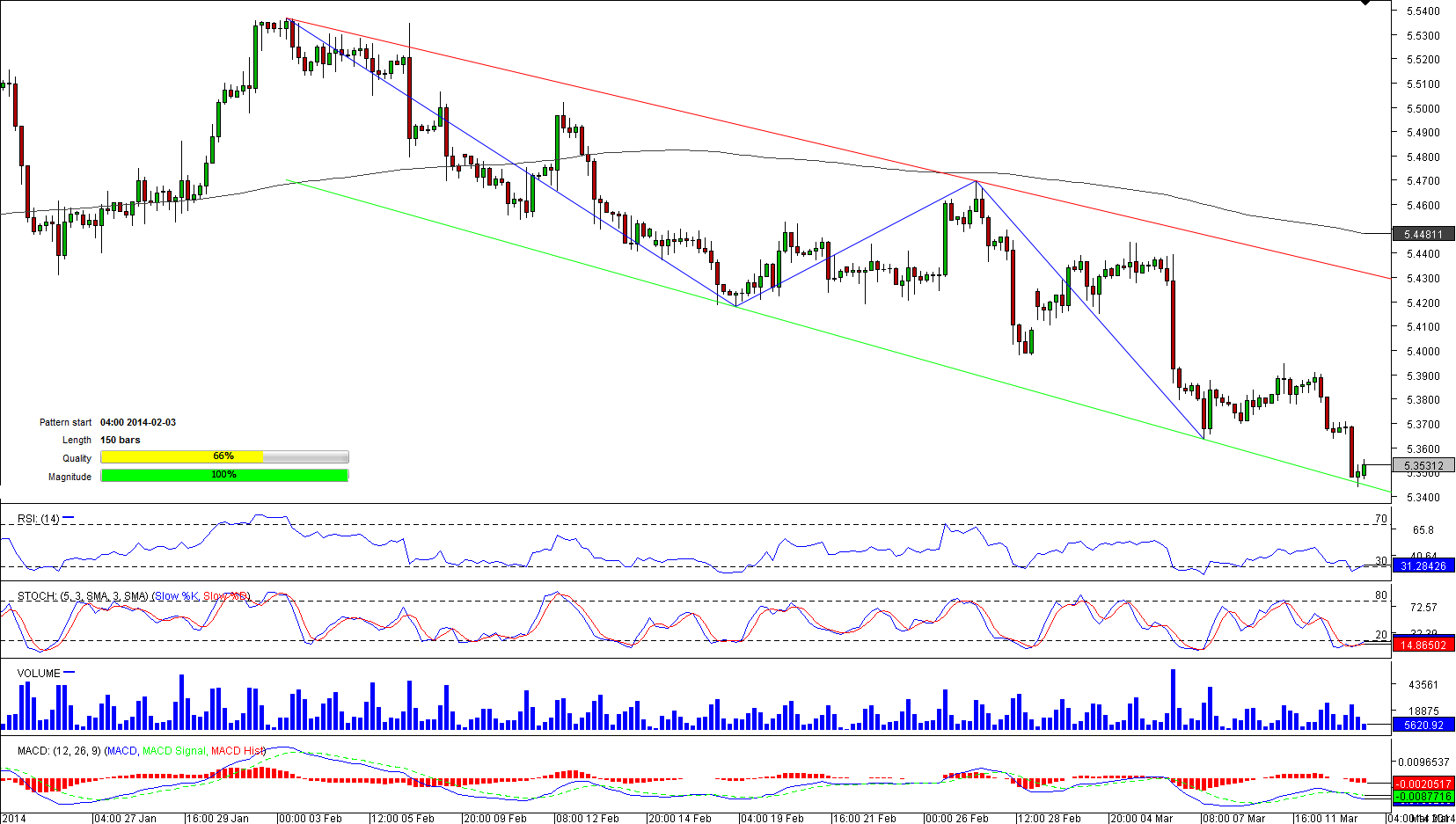 After peaking at 5.8487 in July, the greenback has began losing its ground versus the Danish Krone. While a 1650-pip move during January was adding to signs the depreciation is over, a formation of the channel down is pointing to another steep decline. At the moment of writing the pair was trading almost at pattern's lower boundary, and a move below it will indicate only further movement to the south. Aggregate technical indicators, however, are neutral, pointing to a sideways movement. Moreover, indicators that are showing strength of the trend are suggesting market is oversold. Moreover, 71% of opened positions are long.