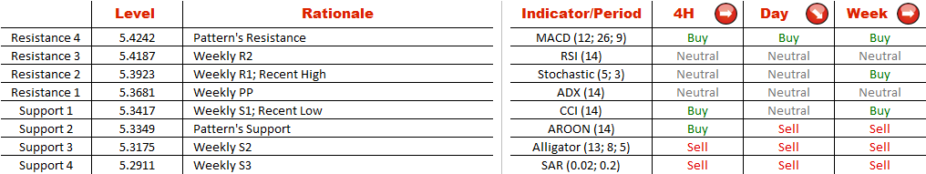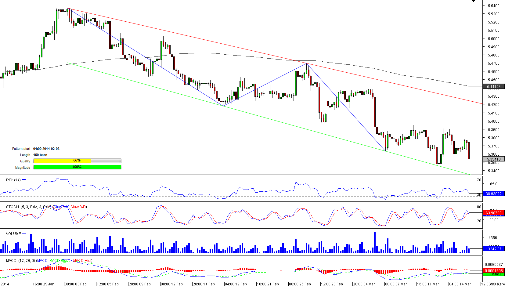 Despite the fact the greenback is bought in 66% of the cases and Danish Krone is sold in 70% of the time, USD/DKK has been losing ground since February 3rd, when the pair formed a channel down pattern. According to technical indicators, the pair will move sideways for some time before moving lower. In case pair fails to move below a recent low and weekly S1 at 5.3440 and 5.3417 respectively, than a move back to a recent high can be expected. While aggregate technicals are pointing at pair's depreciation, MACD is suggesting market is oversold already and the pair will climb higher. The long term outlook is still bearish, and the key level for short traders is located at 5.3175.