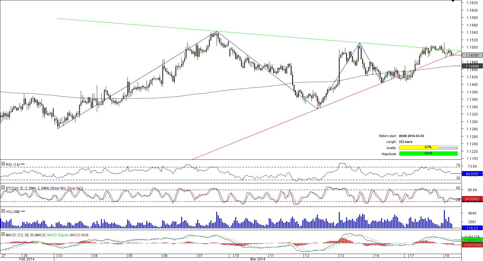 Now the currency couple is on the brink of the breakout as it has already reached the apex of the 223-bar long pattern. At the moment, AUD/SGD is vacillating slightly below the lower boundary of the triangle; however, a number of false breakouts preceding to the current decline increase uncertainty whether this breakout was real.