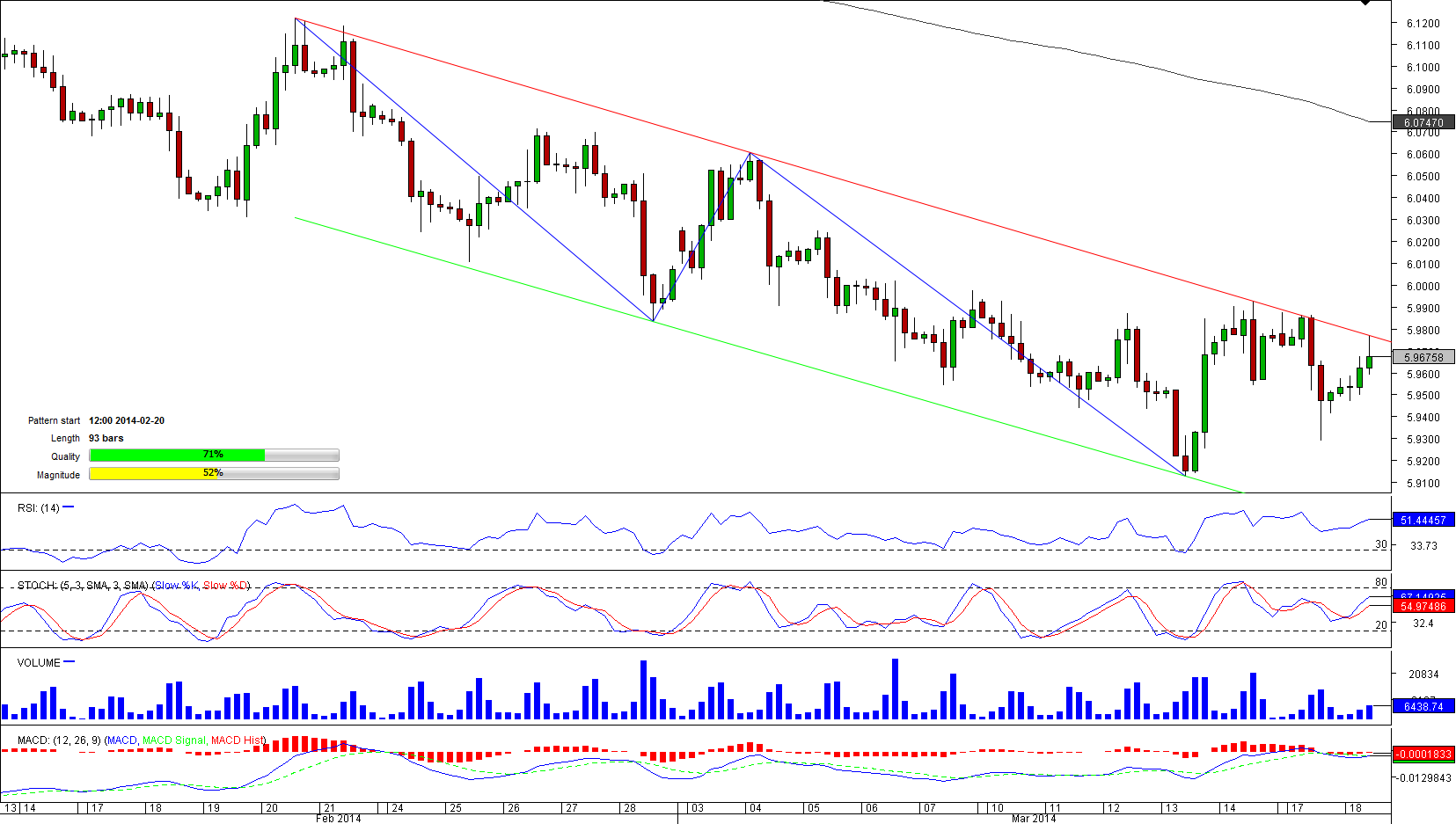 After moving sideways during November and December, the USD/NOK peaked at 6.3145 on February 4 and began its 4000-pip rally to the downside. After a steep decline, on February 20 the pair managed to form a channel down pattern. Despite such a solid performance, bulls can take the initiative soon, as 74% of traders are holding long positions, while during the last several days there were numerous attempts to penetrate the upper boundary. In case it is breached, long traders should focus on a strong psychological level and a weekly R1 at 6.00, while next target can be found at 6.0395. From the downside, pair's depreciation will be limited by 5.8660.