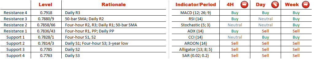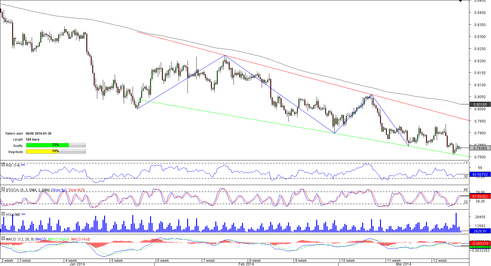 At the moment, the pair is trading near the recent low and given bearishness on the market we may expect CAD/CHF to prolong its losing streak in the hours to come. This is further supported by the fact that only two levels 0.7828/1 (four-hour S1, S2) and 0.7814/3 (daily S1, four-hour S3) lie on the way towards the three-year low and pattern's lower limit.