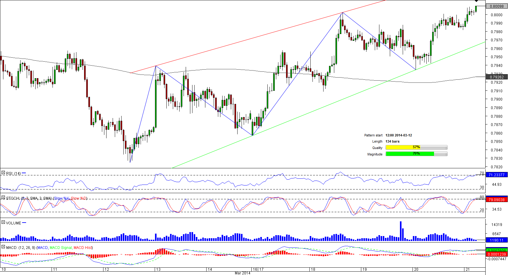 Since early March, the Australian Dollar has been on the rise against the Swiss Franc. The advance has been developing within the range bounded by two upward sloping and gradually converging lines that represent the trend-lines of the 134-bar long rising wedge pattern.