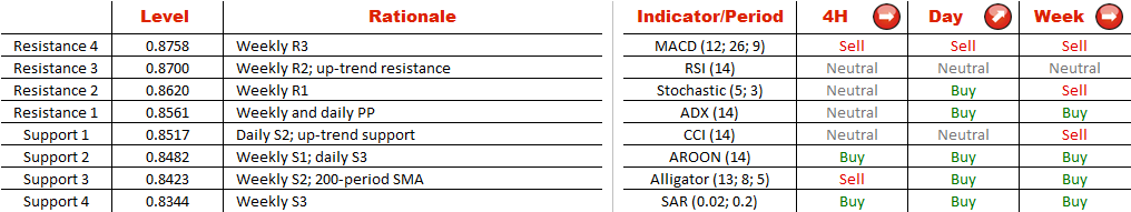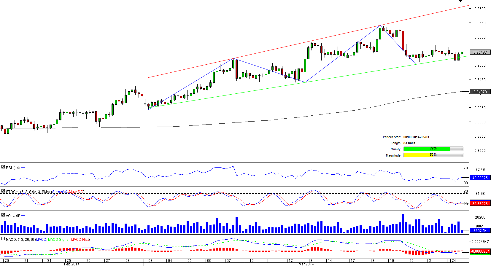 Initiation of the rising broadening wedge on the four-hour chart of NZD/USD dates back to three weeks ago, when the currency pair resumed advancement after a consolidation. Since then volatility of the exchange rate, represented by the trading range, has been increasing, but the price has still been respecting the up-trend lines. In fact, it is currently testing the lower one, at 0.8517, which is reinforced by the daily S2 level.
