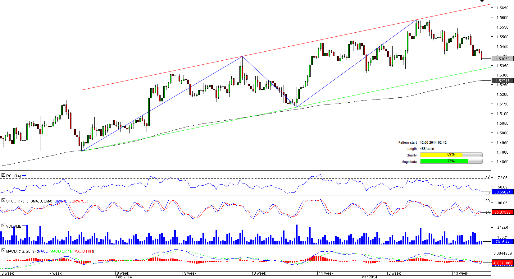 If we analyse the last 180 bars on the four-hour chart of EUR/CAD, we may come to a conclusion that the currency pair is currently forming a bullish channel. Given that this supposition is true, the Euro should turn around before hitting the long-term moving average, namely at the up-trend support line at 1.5353, which is presently reinforced by the daily and weekly S1 levels. Then the price will be well-positioned to target 1.5653, where it will supposedly encounter the upper boundary of the pattern and begin another bearish correction. However, the market does not seem to be optimistic at the moment—merely 40% of the traders are holding long on EUR/CAD positions.