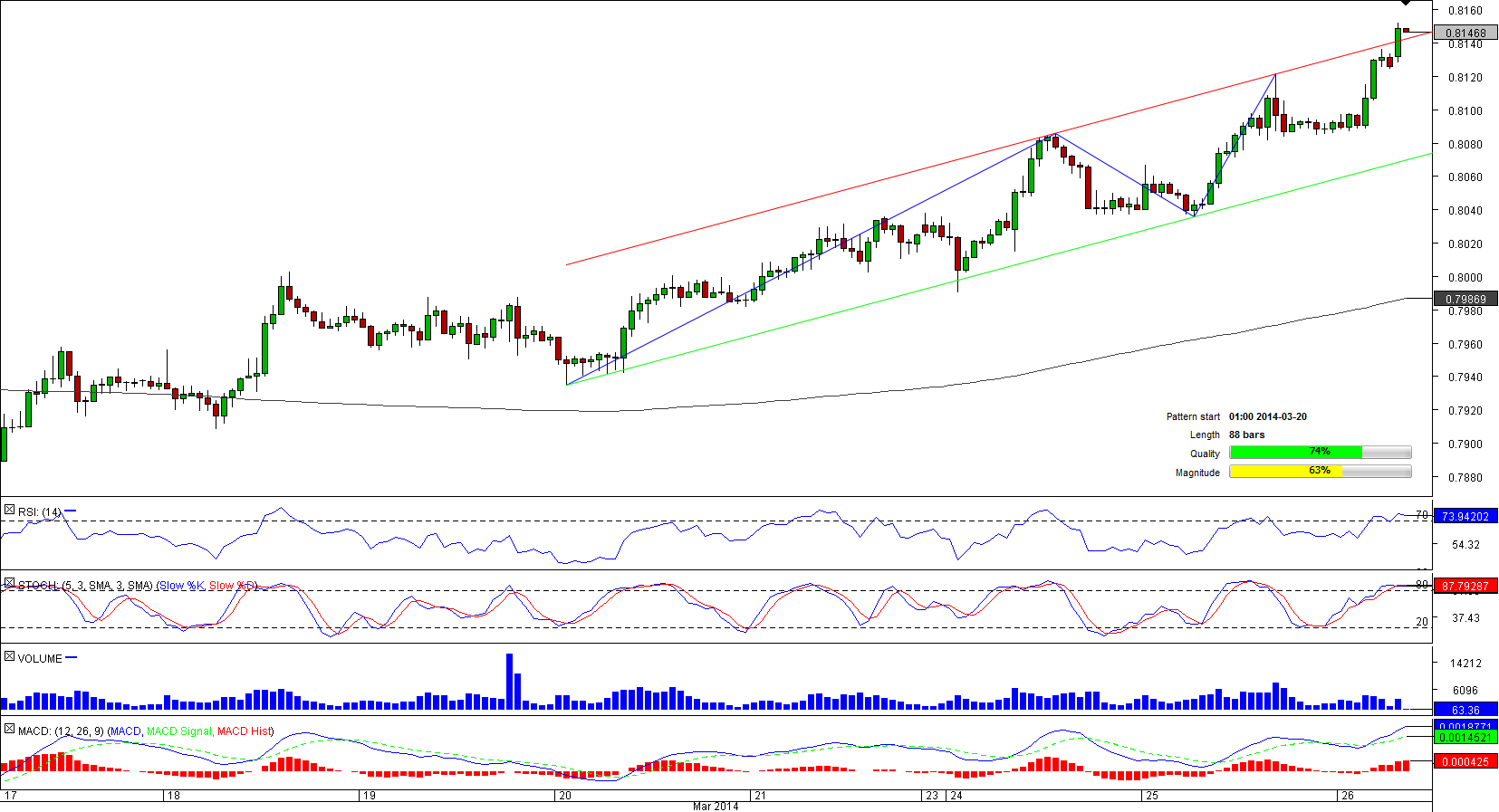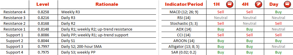 During the last 100 hours the Australian Dollar has been generally outperforming the Swiss Franc, which resulted in emergence of an upward-sloping channel. This implies the support and resistance areas at 0.8086 and 0.8148 respectively. However, the latter level is currently being tested and it needs to prevent additional appreciation of the Aussie in order to confirm validity of the pattern. In this case AUD/CHF will be expected to retreat back to the weekly R1 before starting another bullish leg. Alternatively, the pair may close above 0.8148, which would suggest continuation of the rally, potentially up to the weekly R3 level at 0.8258.