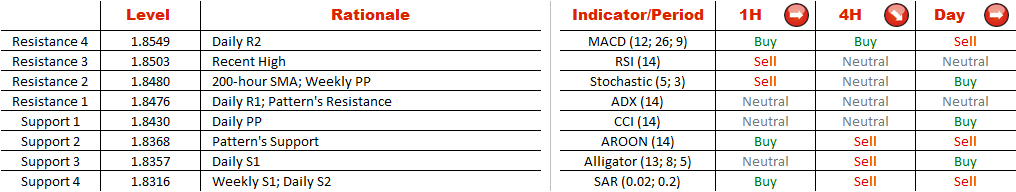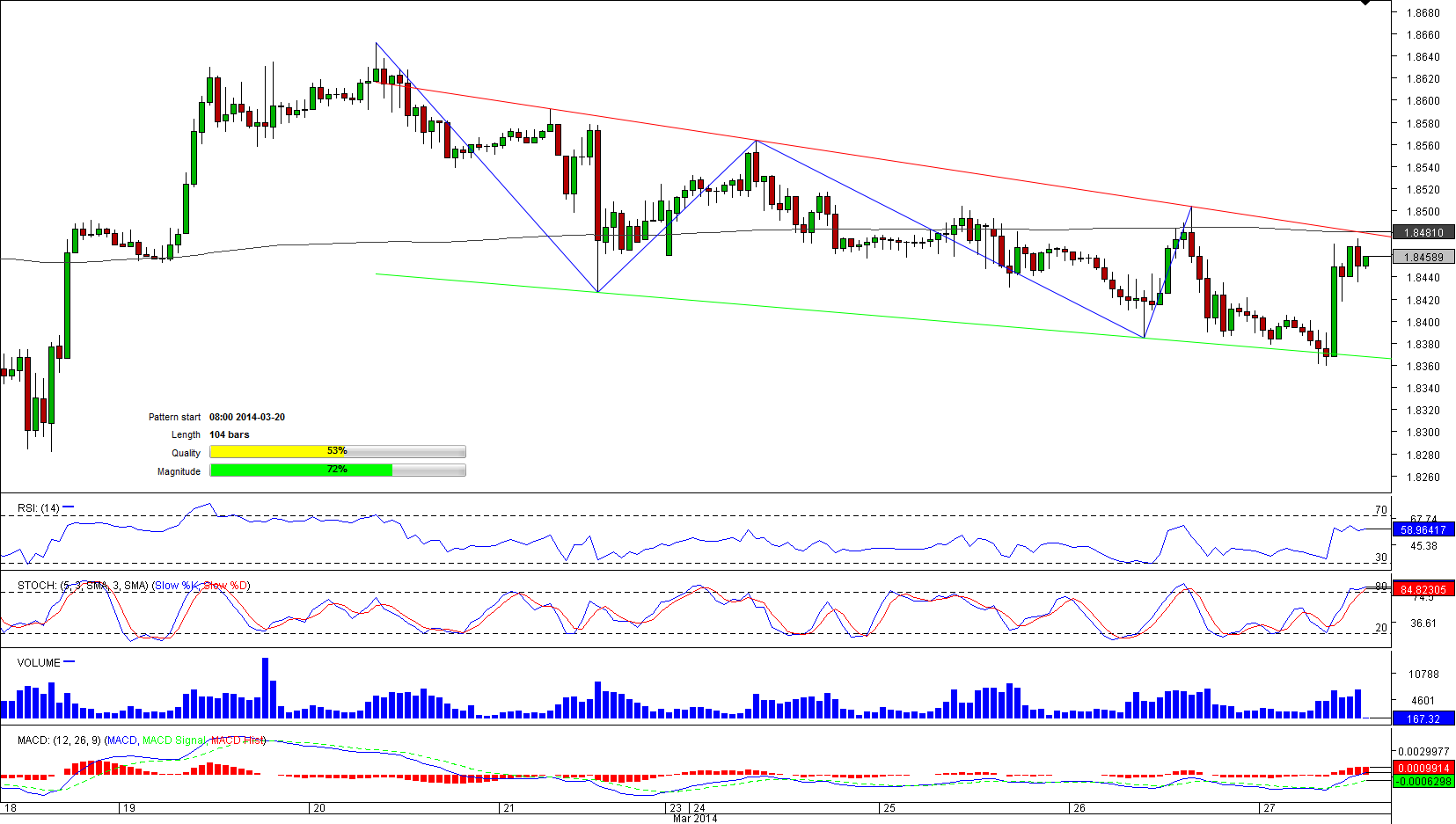 Even though wages do not have an apex point where both trend lines converge, they also represent a great opportunity for traders to make substantial profits in a short period of time. The trading range on GBP/CAD is narrowing rapidly and soon the pair will be forced to break either the upper of the lower trend line. In this particular case the downside breakout is more probable, as bulls are facing a bunch of resistance lines right at the level of pattern's resistance. It includes the 200-period SMA, weekly pivot and a daily R1. Moreover, technical indicators on a 4H chart are pointing to the downside movement, therefore, a recent touch of the resistance line is a ‘sell's signal.