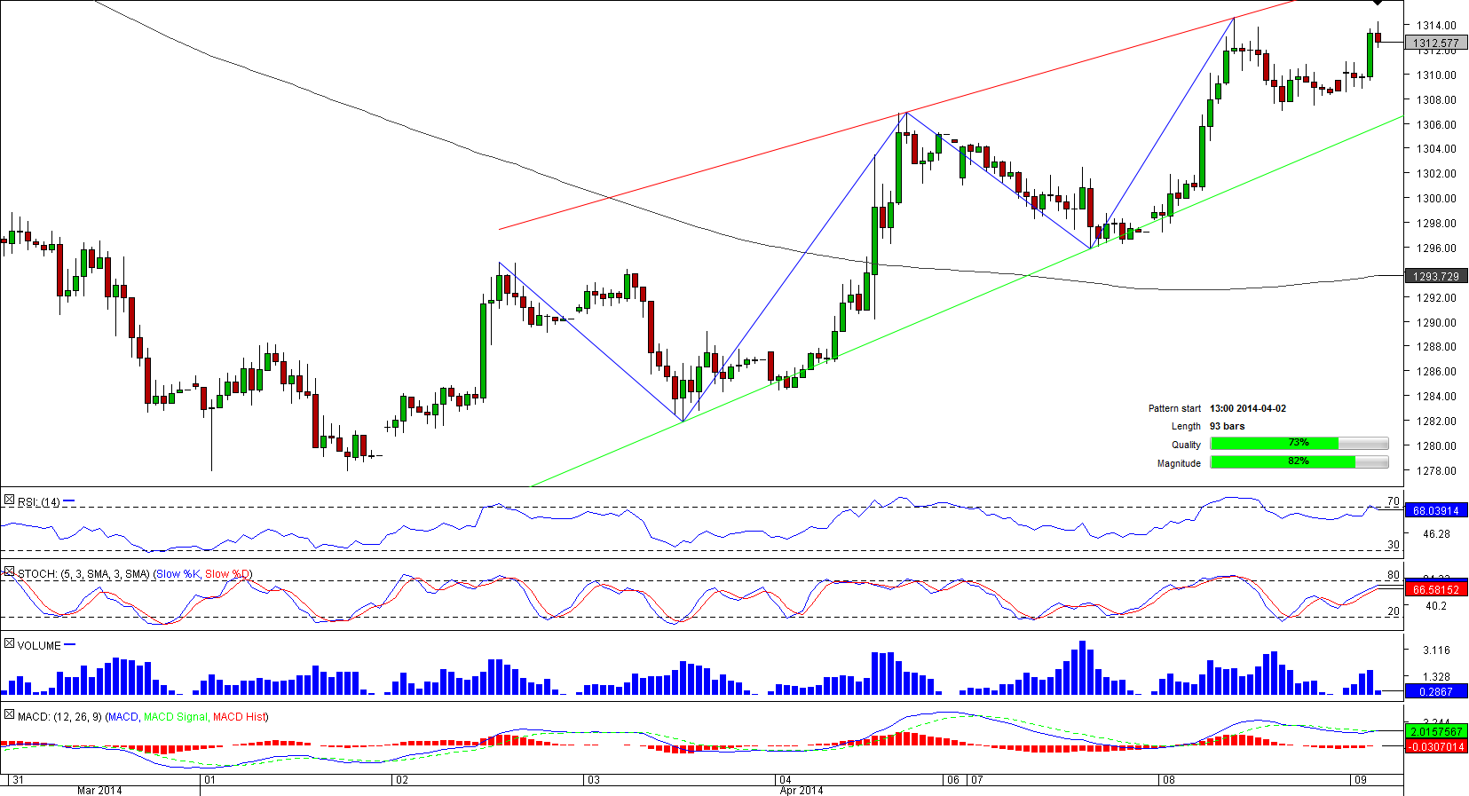 The current gold's uptrend followed a two-week decline started in mid-March when the bullion approached a seven-month high of 1,390.54. At a time when the upswing commenced gold started to shape a rising wedge pattern that now is over 90-bar long.