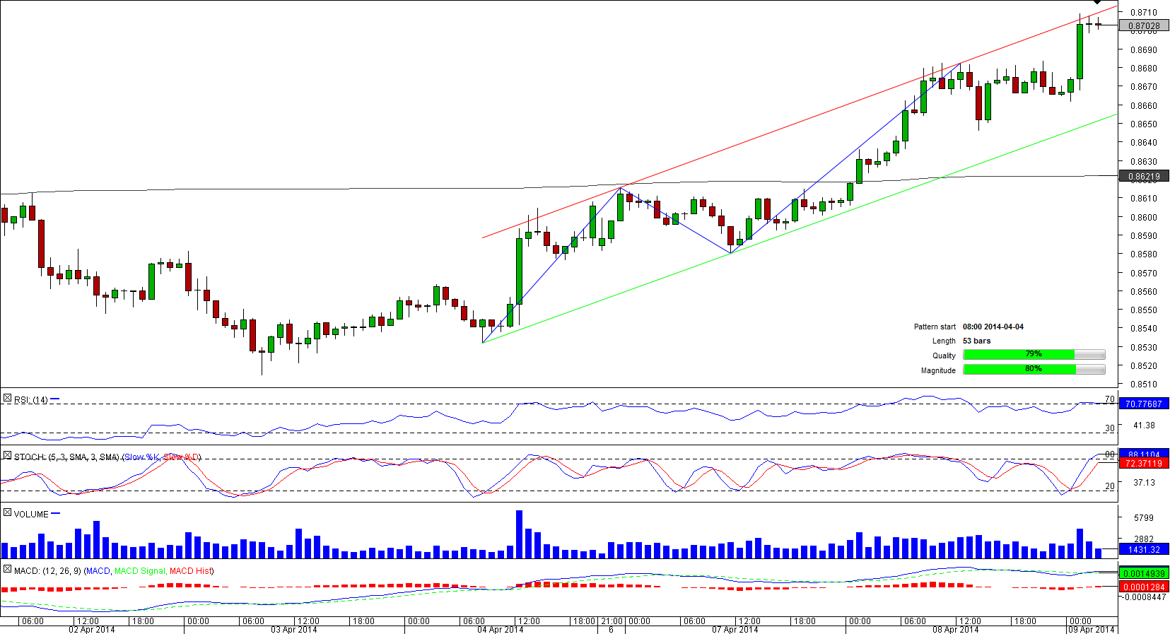 Thanks to a support lent to NZD/USD by a steep bullish tunnel, the pair managed to attain a three-year high of 0.8711, close to which it is trading now. The pattern, despite being relatively short, only 53-bar long, has both quality and magnitude above average, adding to probability that it will continue to push the pair higher.