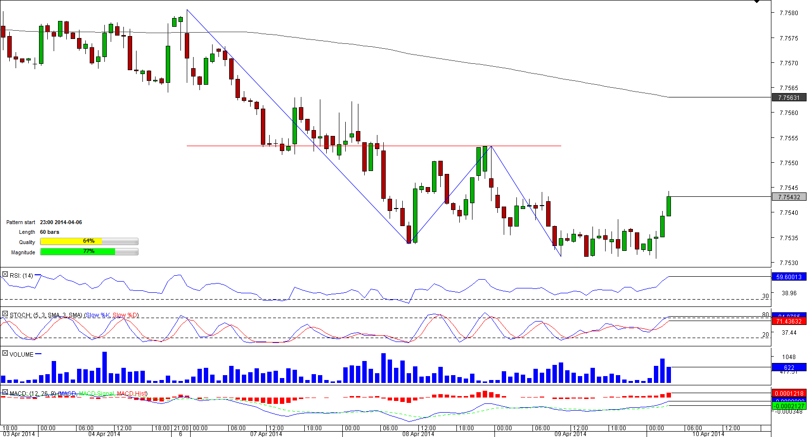 Having hit a one-month high of 7.7677 in mid-March, USD/HKD followed a bearish trend and started to shape a double bottom pattern early April.