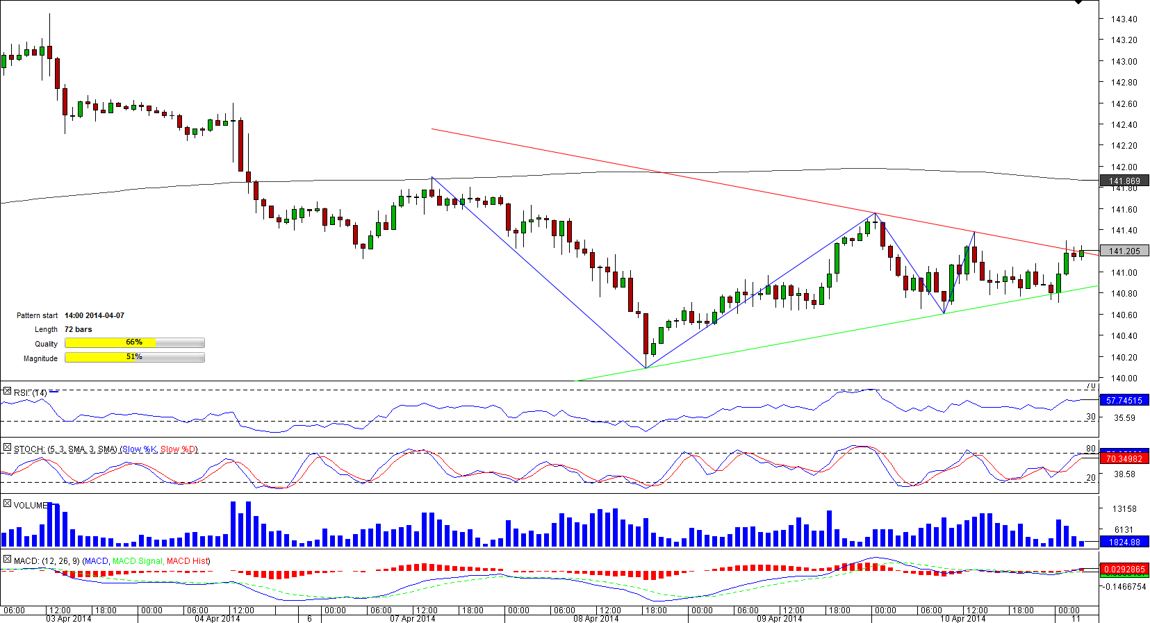 Since early April the single European currency has been steadily depreciating against the Japanese Yen. The decline started at a one-month high of 143.50 hit on April 2 and already on April 7 the pair entered a 72-bar long triangle pattern.