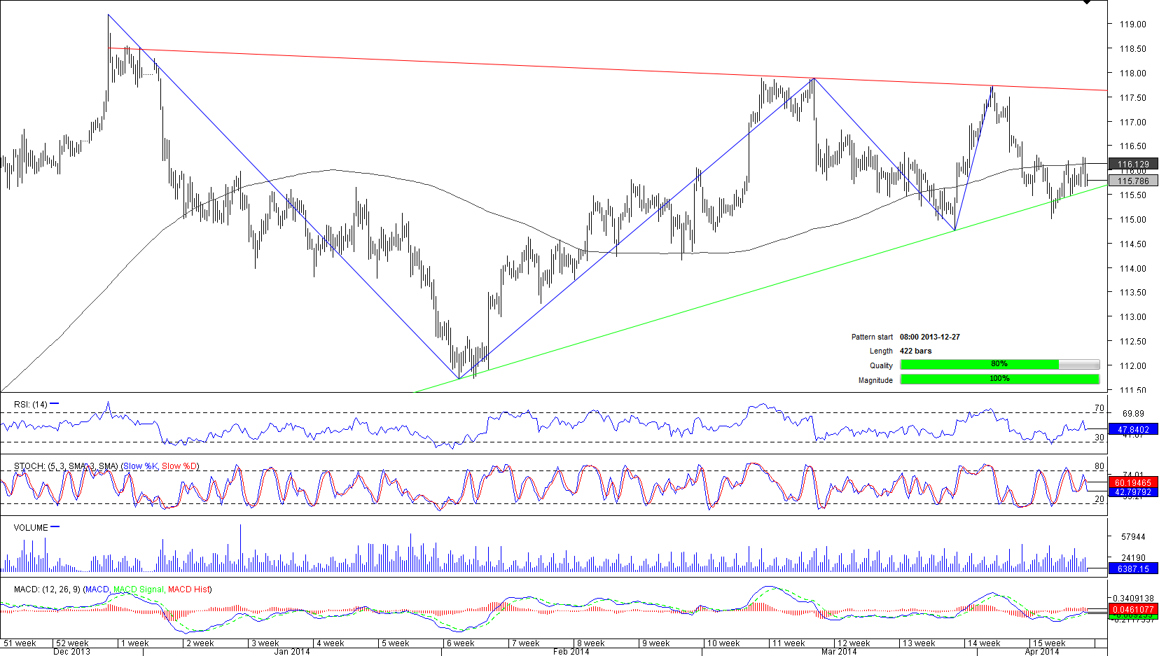 Strength of the Swiss Franc has been a major concern for the SNB. Nevertheless, due to its safe-haven appeal and significant depreciation of the Japanese Yen, the CHF/JPY pair hit its historically highest level on December 27. After that the pair began a sideways movement, and according to technical indicators, the pair will continue its fluctuation even in a longer term. Nevertheless, the pair can be highly volatile soon, as recently bears made an attempt to penetrate pattern's support line, while 71% of opened positions is short. In case the lower boundary is breached, short traders should focus on a recent low, weekly S1 and daily S2 at 115.11.