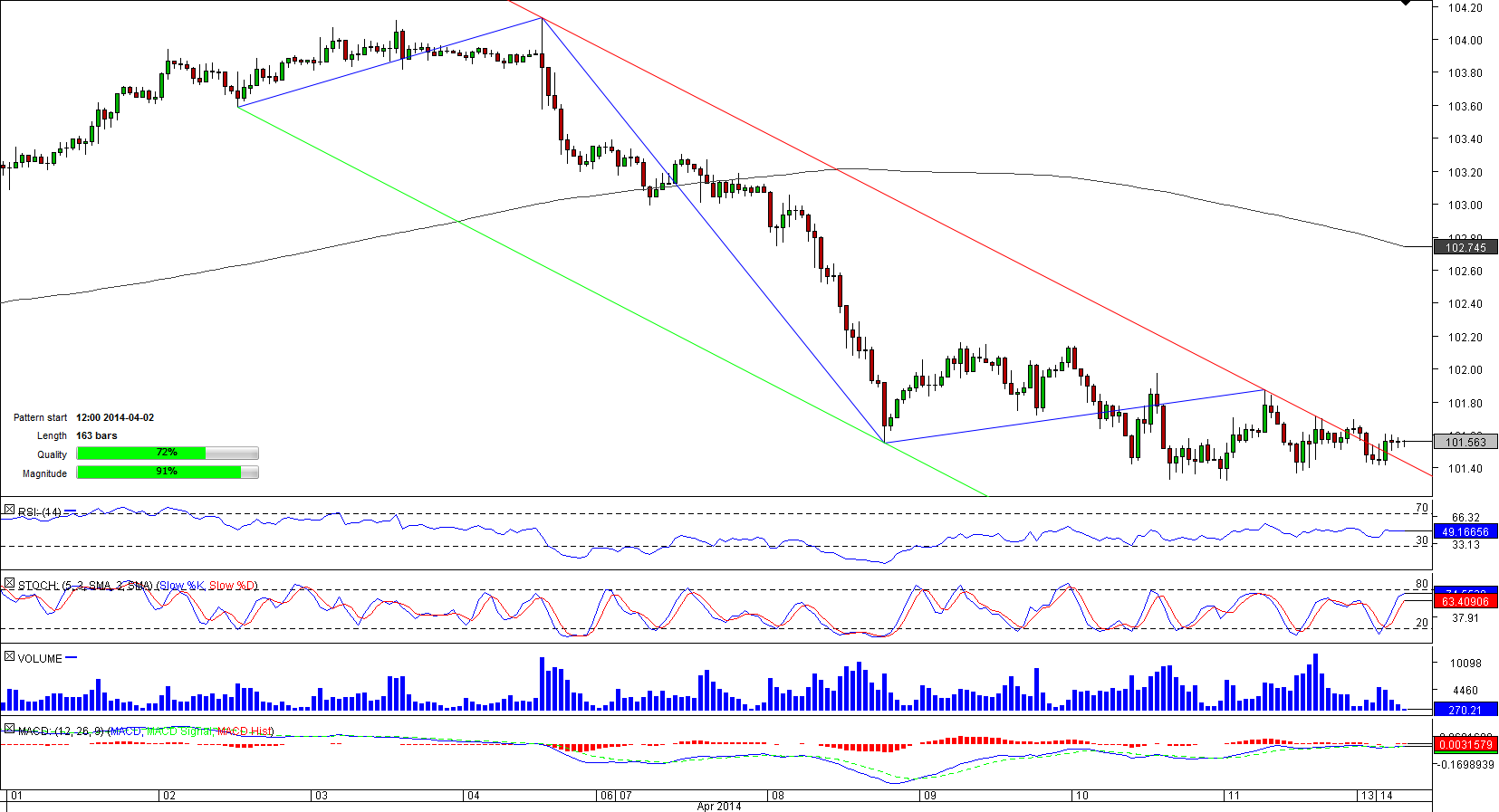 USD/JPY commenced a retreat at a three-month high of 104.12 attained in the very beginning of April. The decline has been being performed in the 163-bar long bearish corridor that pushed the pair to a three-week low two days earlier.