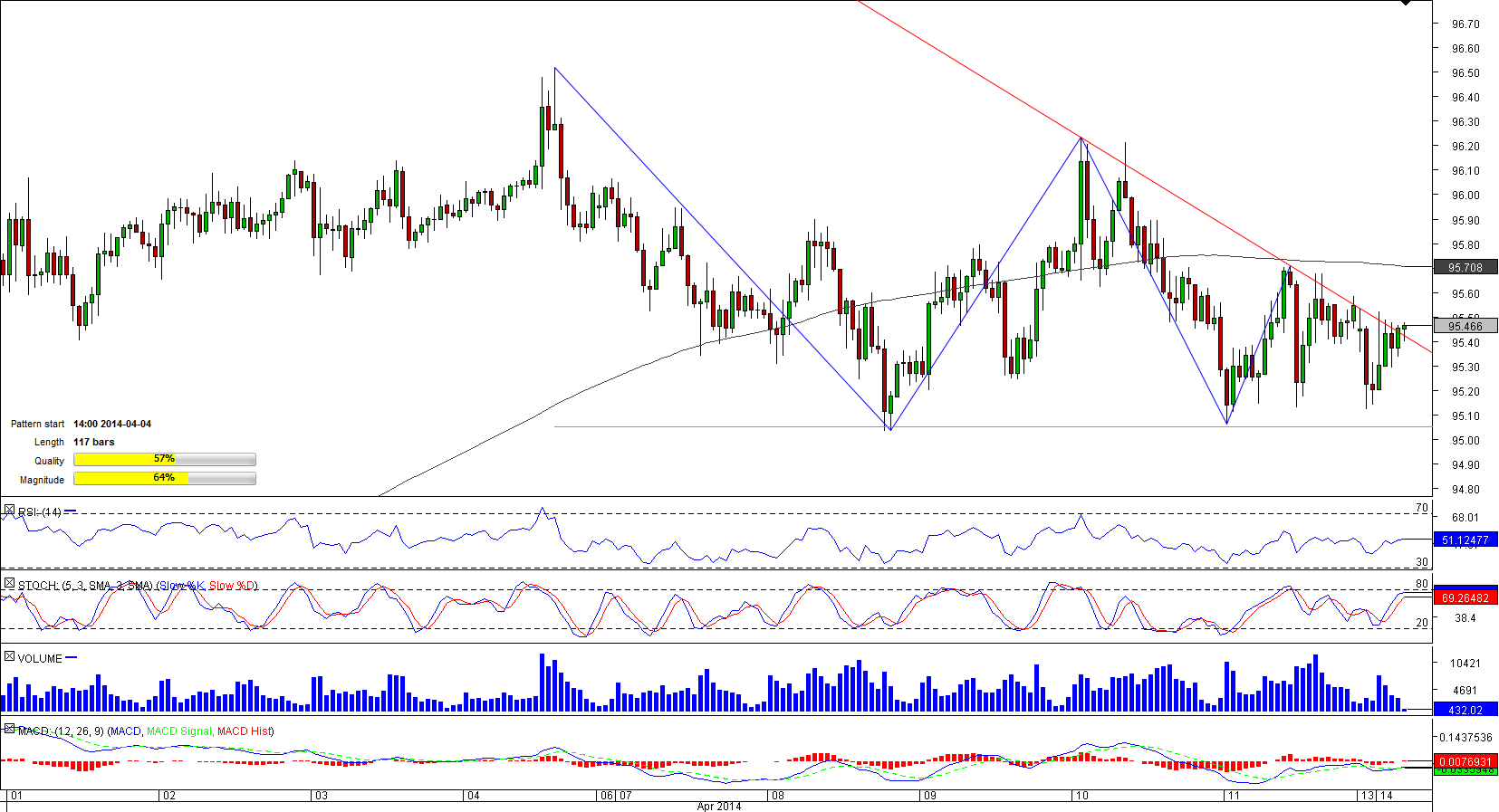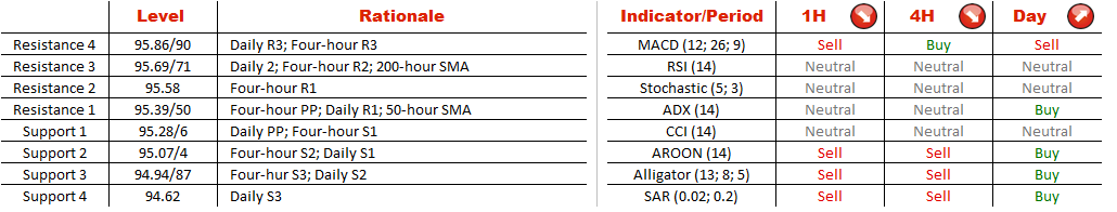 Since mid-March the Australian Dollar has been on the rise against the Japanese Yen and the pair is not likely to cease its advance in the hours to come since the descending triangle pattern formed early April seems to have failed to contain the pair's climb. If the pair succeeds in consolidating above the triangle boundary, it is likely to witness an accelerating advance that may push it above the 50-and 200-hour SMAs, meandering at 95.52 and 95.70. The bullish scenario is also bolstered by the SWFX numbers, showing that 73% of market participants expect AUD/JPY to gain in the foreseeable future.