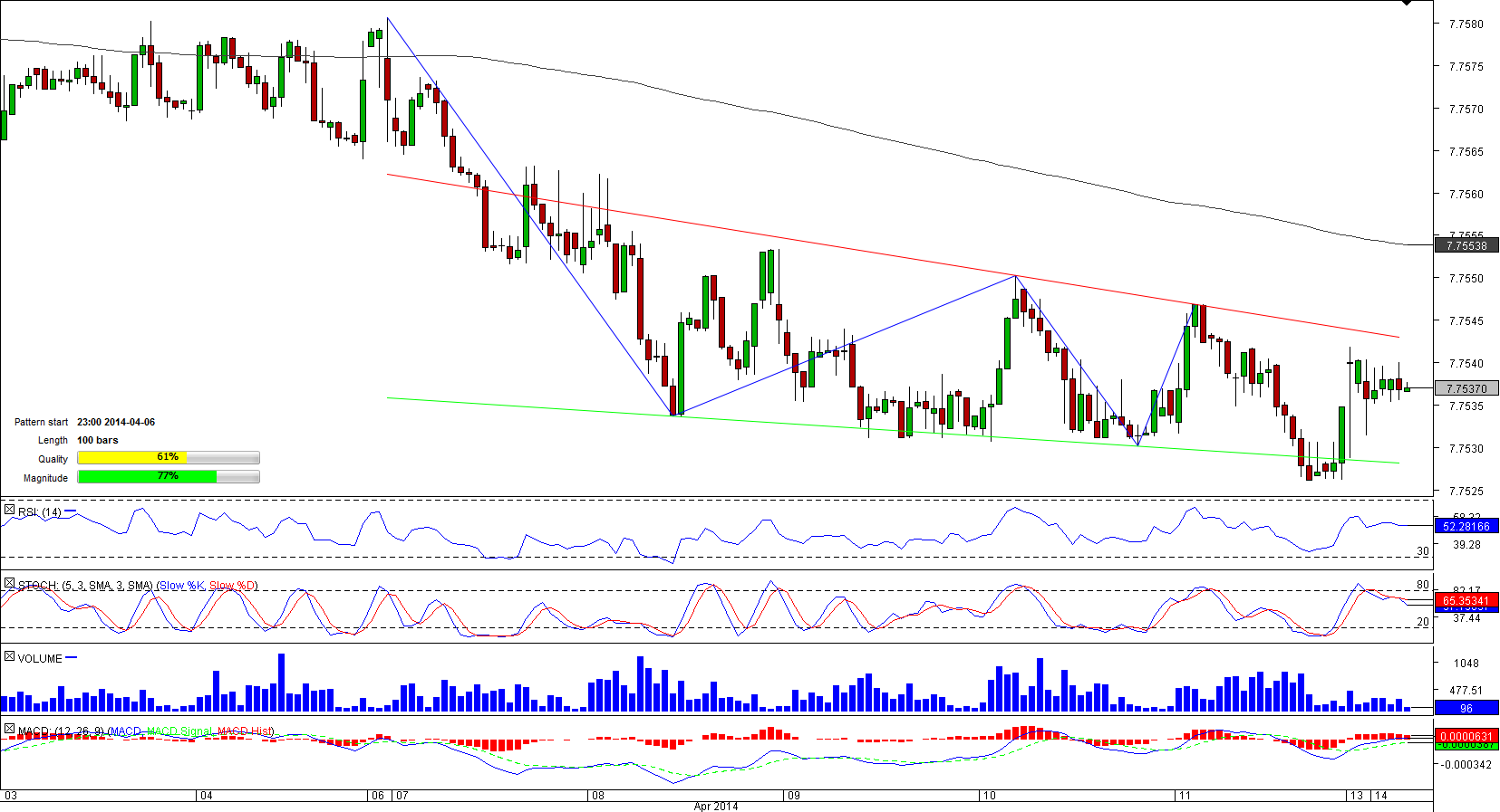 A jump to a six-week high of 7.7677 in the second part of March provoked a massive sell-off of USD/HKD that had lost almost a hundred pips before it slowed down the pace of decline and entered a falling wedge pattern that now is circa 100-bar long.