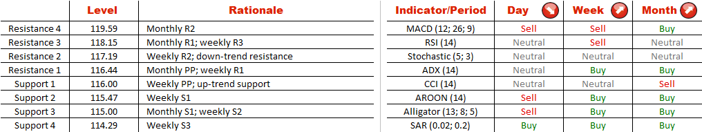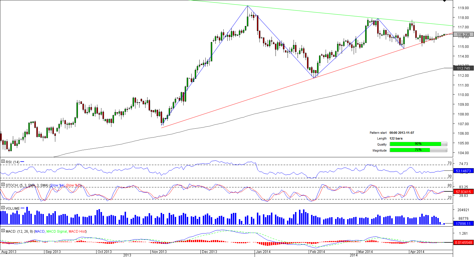 There is a high-quality and high-magnitude symmetrical triangle forming on the daily chart of CHF/JPY. Initiation of the pattern dates back to the first part of November, when the currency soared after approaching the 200-day SMA. However, as it subsequently proved to be unable to ascend beyond 119.19, every consecutive peak was lower than the previous one. Still, this weakness is likely to be only temporary, as the triangle assumes continuation of the general trend, namely further appreciation of the Swiss Franc. Moreover, being that most of the weekly and monthly technical indicators are currently bullish, hardens the case of a soon break-out to the upside.