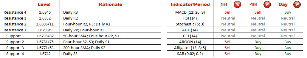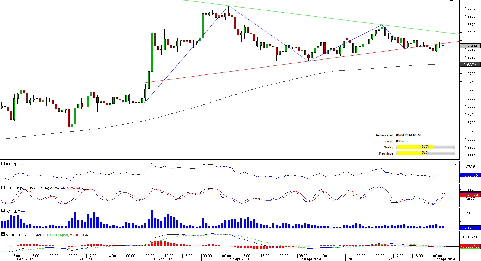 The currency pair has recently exited the formation by crossing the lower boundary of it. Despite the fact the sharp decline did not happen, the pair is not strong enough to prove the breakout was false by returning to the pattern as the 50-hour SMA at 1.6794 is blocking the upswing. According to the technical data, the pair is likely to slide in the next hour but may advance in the medium and long perspectives.