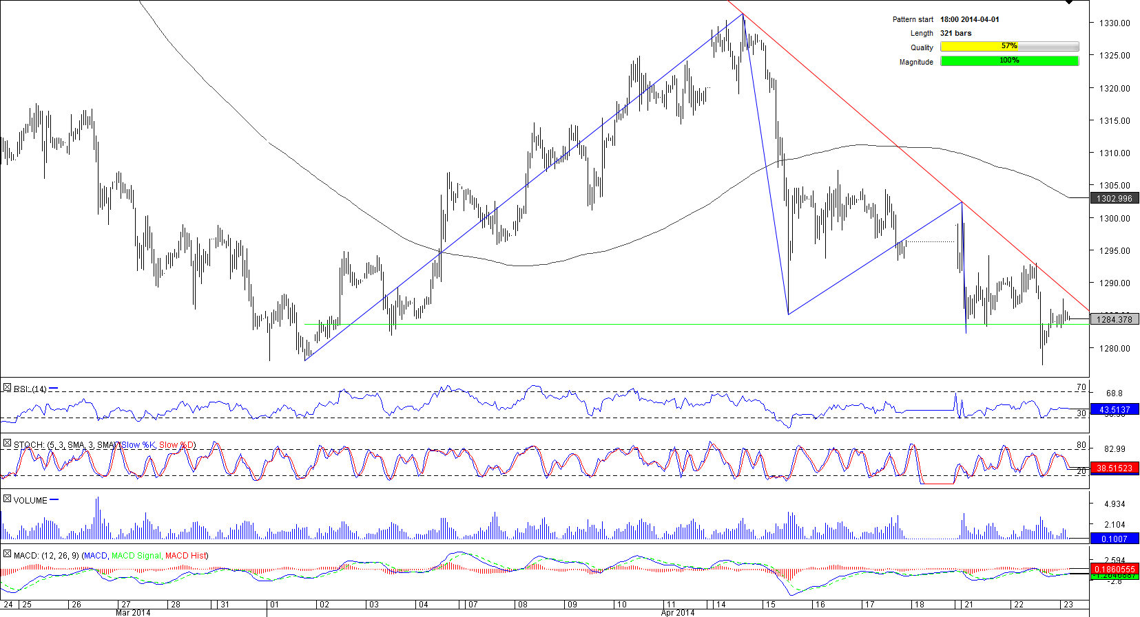 XAU/USD has recently breached the pattern's support at 1,283.56 but a breakout did not follow as the yellow metal managed to return to the triangle area. In the hours to come, gold is likely to gain more ground given that almost 70% of traders at the SWFX are bullish on the instrument. Dwelling on the potential advance, we add that proximity of the apex may even turn the expected jump into a bullish breakout.