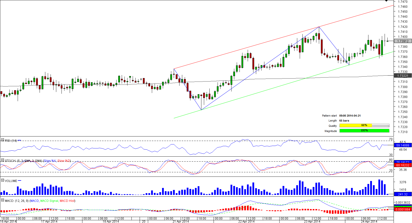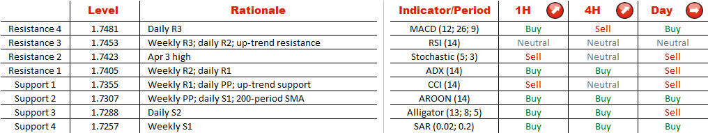 During the period between Apr 11 and Apr 21 EUR/USD was constantly trading next to the 200-hour SMA. But recently the currency pair has overcome the gravity of the long-term moving average and commenced a recovery. However, at the moment the rate is facing a number of tough obstacles that may not let the common currency to continue developing the bullish channel. The immediate resistance is at 1.74, represented by the weekly R2 level. The next hurdle is at 1.7423, which is the high seen on Apr 3 and may thus pose a threat to further advancement. Still, there are plenty of technical studies giving ‘buy' signals on the hourly and four-hour time-frames.