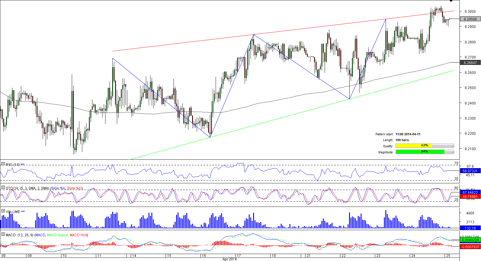 EUR/NOK jumped to a one-month high of 8.3039 on April 24 that lies above the upper limit of the formation. However, the rally did not lead to a breakout as the pair promptly returned to the pattern. Now the currency couple is likely to continue erasing earlier gains as more than 80% of market players bet on depreciation of the pair.