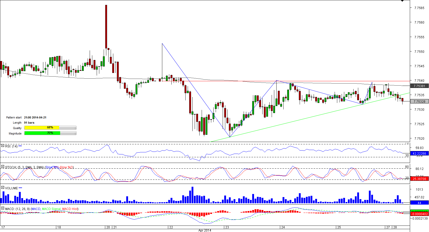 A jump to a one-month high of 7.7677 provoked an accelerating decline of USD/HKD that lasted during more than a month and ended only when the pair touched a three-month low of 7.7520 on April 22. This low gave the pair an impulse to erase some of the previous losses and pushed it into an ascending triangle pattern.