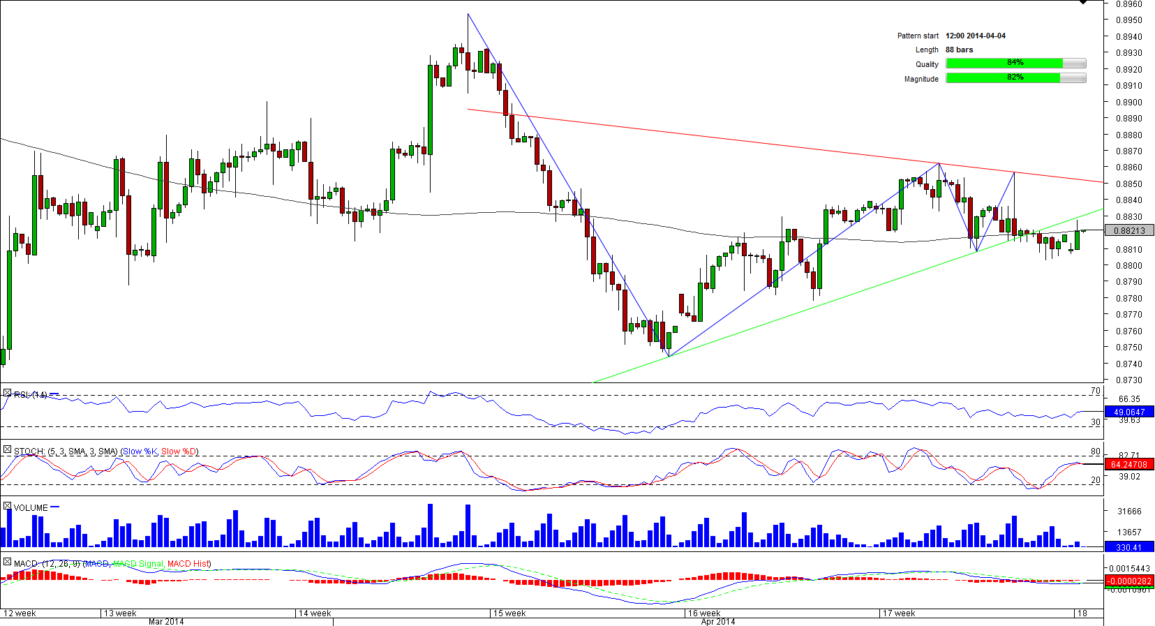The 88-bar long triangle pattern formed by USD/CHF originated not far away from a three-year low of 0.8698 hit in mid-March. Despite being relatively short, the pattern has both quality and magnitude above average.