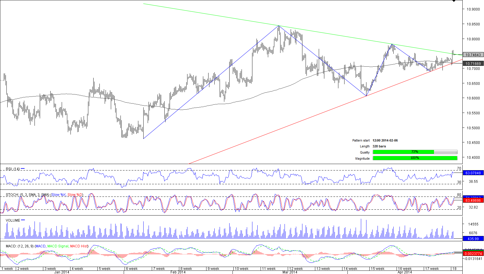 The EUR/HKD is not one of the main currency pairs, though, it can be highly attractive for investors in the coming days. Triangle patterns represent great opportunity for traders, who seek for high profit in a short period time. On May 1 both upper and lower trend lines will converge, and the trading range will be equal to zero. Market sentiment is strongly bearish, with more than 72% of opened positions being short, however, traders were selling the single currency for the last half a year, and still it was not able to hold the rally. The outlook is bullish, as technicals are sending ‘buy' signals, while just recently bulls made an attempt to move above pattern's resistance.