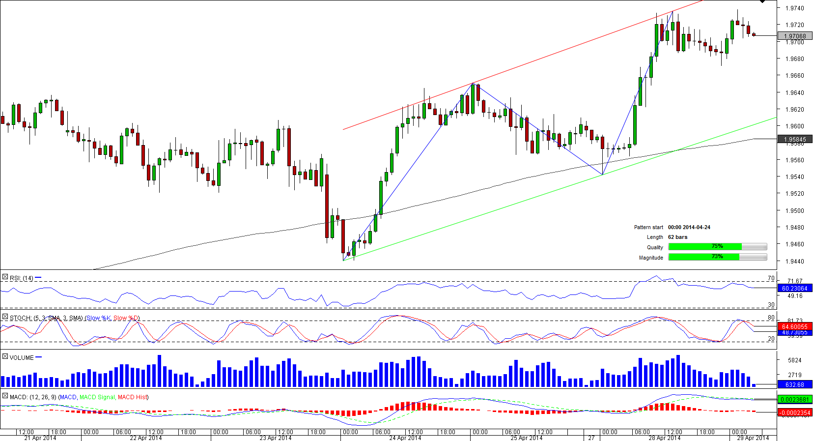Now the pattern still is relatively short, only 62-bar long, but its quality and magnitude a well above average. Considering that more than two thirds of traders are bullish on the pair, the instrument is likely to prolong the formation in future and may soon surpass a two-month high of 1.9737, not far away from which it is sitting at the moment.