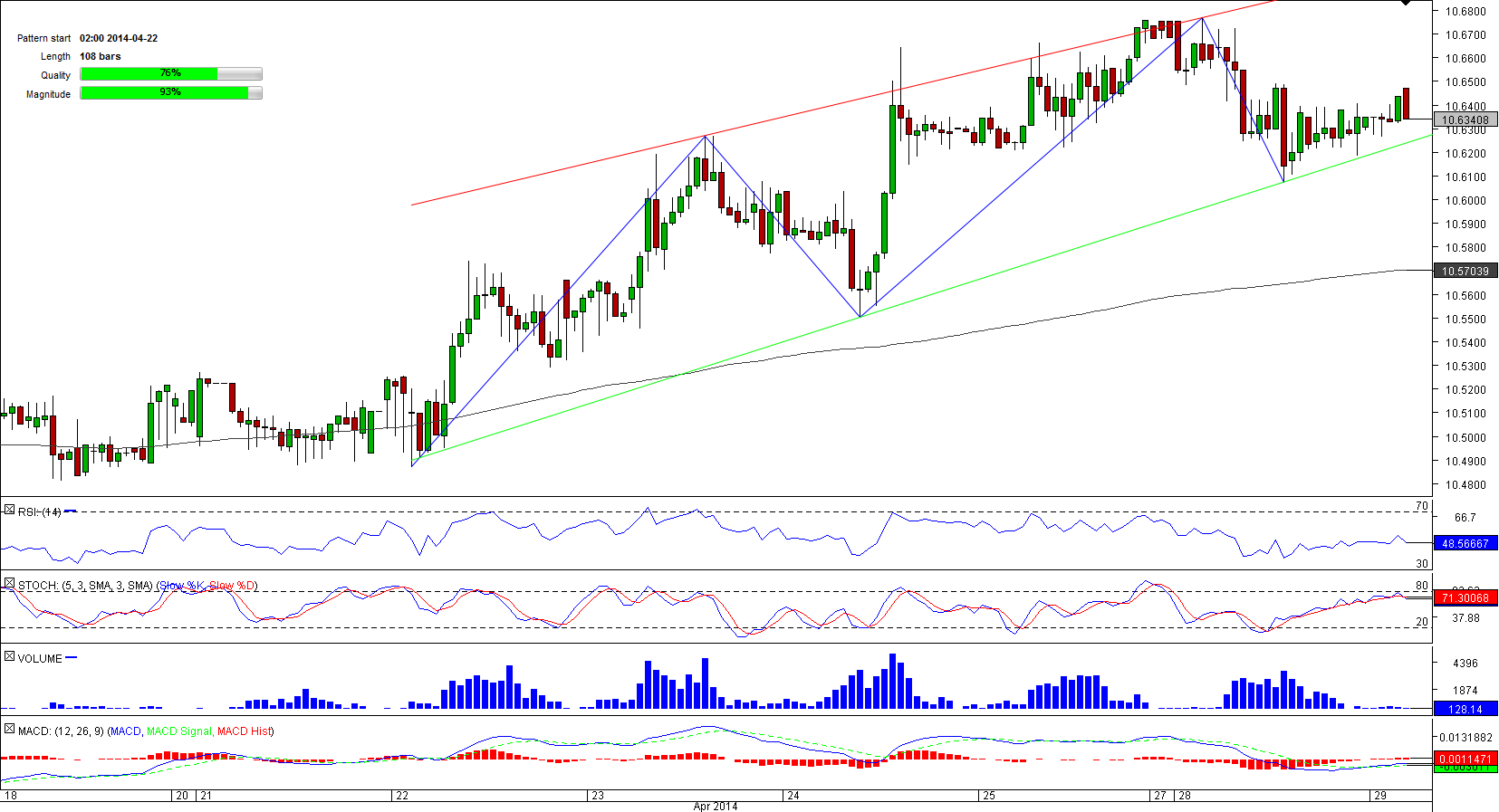 An advancement of the U.S. Dollar against the South African Rand started at a six-month low of 10.3604 reached in the first part of April. Since then, the pair has been on the rise and started to shape a rising wedge pattern later in the month.