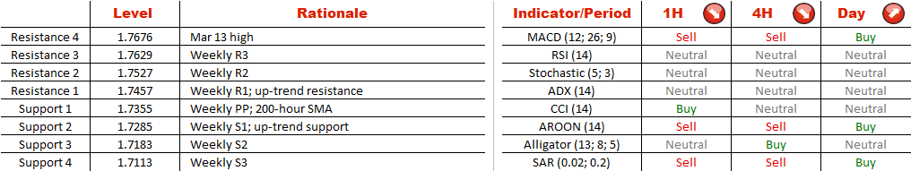 The sell-off that began in the second part of March was stopped near 1.72, and since then the Euro has been generally appreciating relative to the Singapore Dollar, leading in the end to formation of the bullish channel. At the moment the currency pair is bearish, being that it has just confirmed the upper boundary of the pattern. Therefore the exchange rate is expected to fall through the immediate support at 1.7377/55, which consists of the weekly PP and 200-hour SMA, and target the lower rising trend-line near 1.73, where it will also meet the weekly S1 level. Meanwhile, the sentiment toward EUR/SGD is strongly negative—merely 26% of open positions are long.