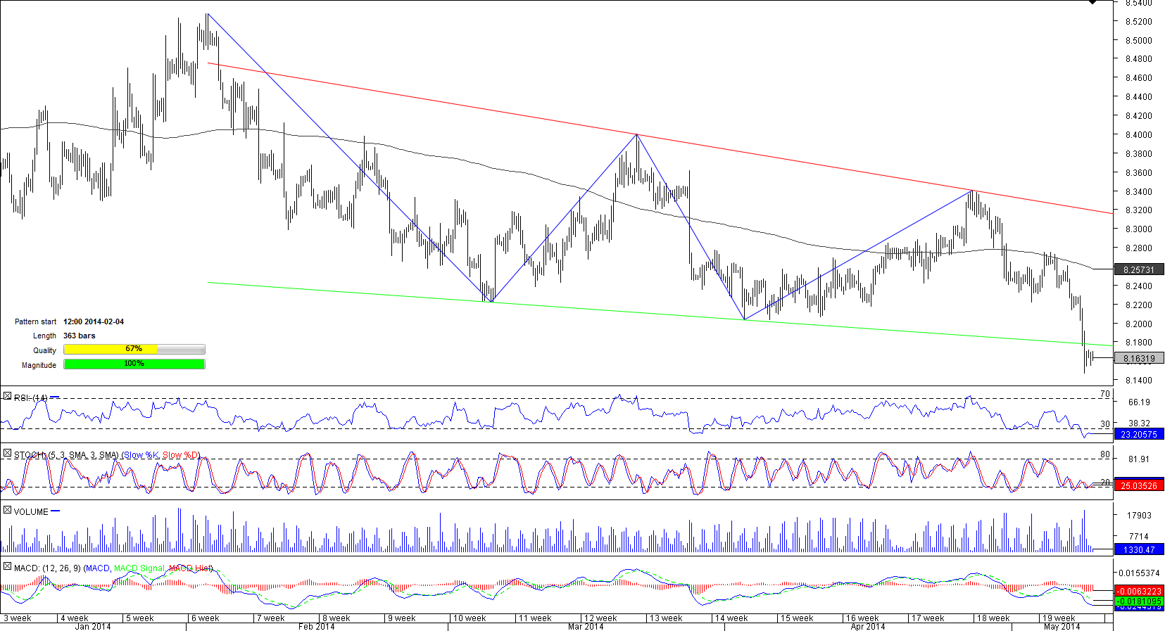 After penetrating the lower limit of the pattern, the pair found support at a six-month low of 8.1468 that postponed a further drop. However, this line is expected to be breached before long-over 84% of players at the SWFX are bearish on the pair, meaning that an accelerating decline may be looming. Technical data also bolsters traders' view, pointing to a weakness in the short-term.