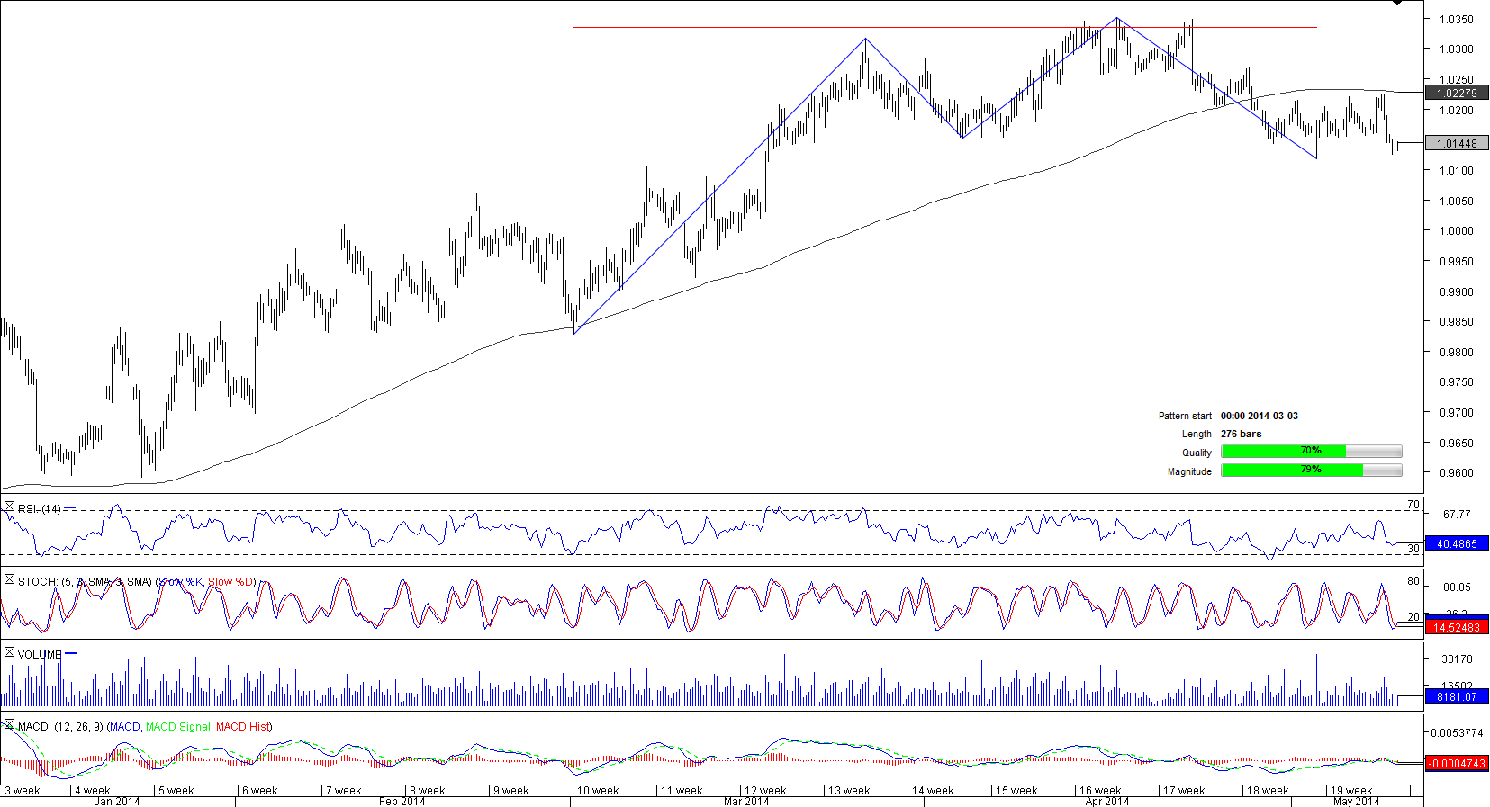 This year's rally, which was initiated just above the level of 0.94, was stopped by the resistance at 1.0333. However, the currency pair did not change its direction after the encounter and continued to trade between this level and the support at 1.0135, implying that there may potentially emerge a rectangle pattern. If this is the case, eventually AUD/CAD is likely to resume its surge, something that will require a breach of the Apr highs. And while the weekly technical indicators are in favour of the Aussie's appreciation relative to its Canadian peer in the long term, the market appears to be undecided—50% of positions are long and 50% are short.