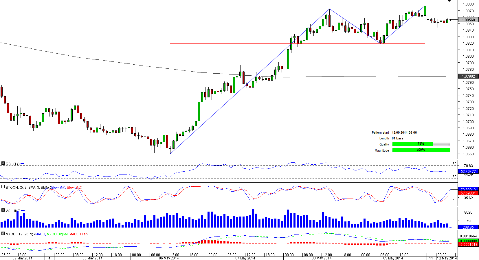 Although the pair now is on its way towards the neck-line at 1.0769 since the instrument has already commenced a retreat from the second peak, market players do not expect AUD/NZD to drop-more than 86% of all orders on the SWFX are long. If the traders' view comes true, the pair is likely to bounce off the 50-bar SMA at 1.0846; however, the rally is not likely to be long-lasting given a heavy selling pressure pertaining to the current phase of the pattern.