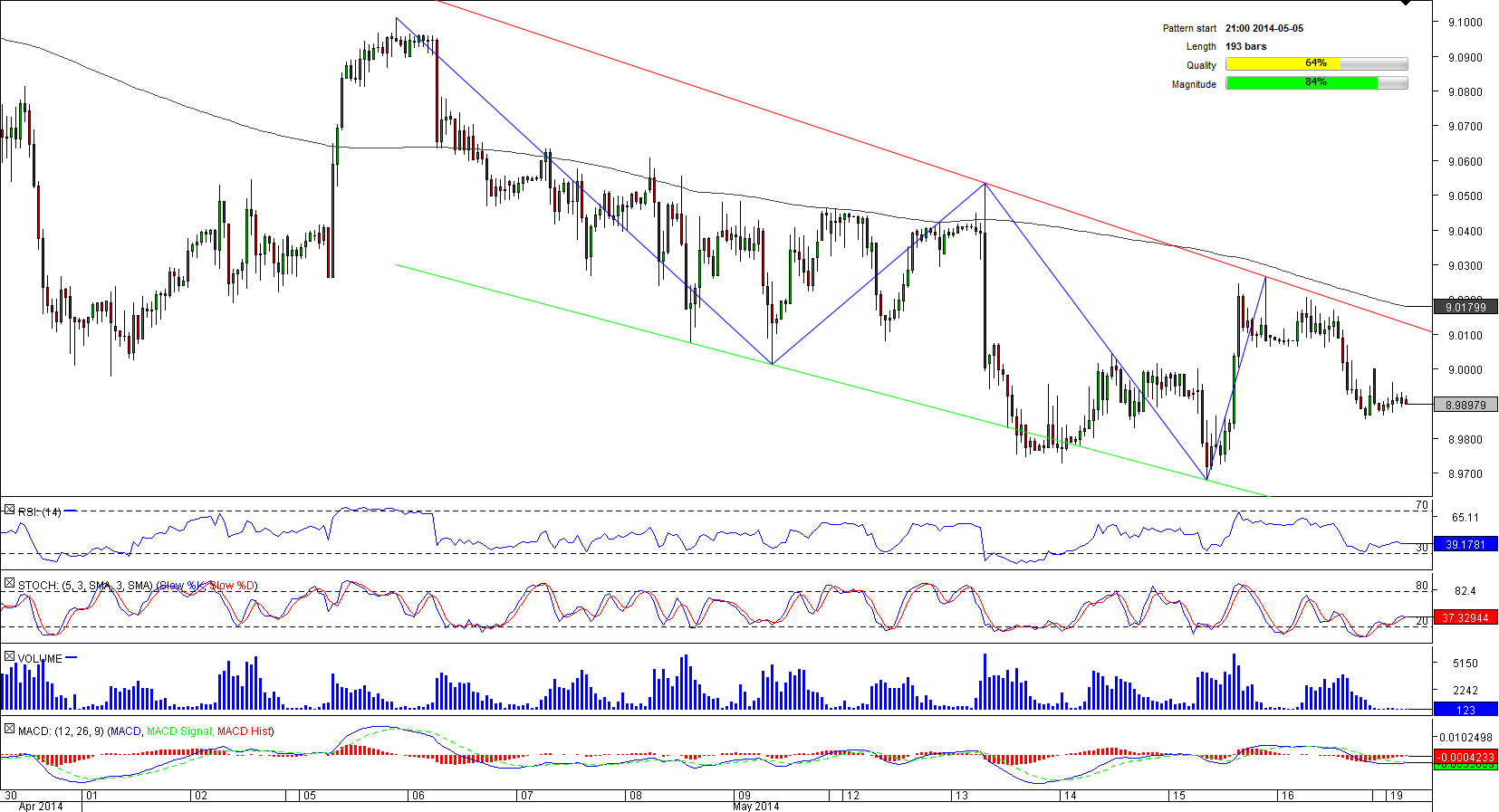 EUR/SEK attained a three-year high of 9.1393 late April and since then the pair has been in the downtrend. The decline that is taking place inside a gradually converging downward-sloping channel sent the EUR/SEK to a one-month low of 8.9682 in mid –May.