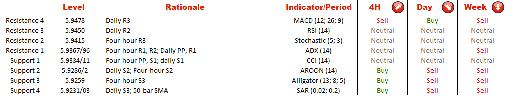USD/NOK is likely to extend its losing streak in the hours to come, taking into account the SWFX sentiment- more than 76% of all orders are placed to sell the pair. If this comes true, the pair may plunge below 5.9334/11 (four-hour PP, S1; daily S1) and then it is likely to test 5.9286/59 (daily S2; four-hour S2, S3). A dive below the latter support zone will push to the fore the level of 5.9231/03 (dailyS3; 50-bar SMA) that is the last defence against a slide to the lower limit of the formation.