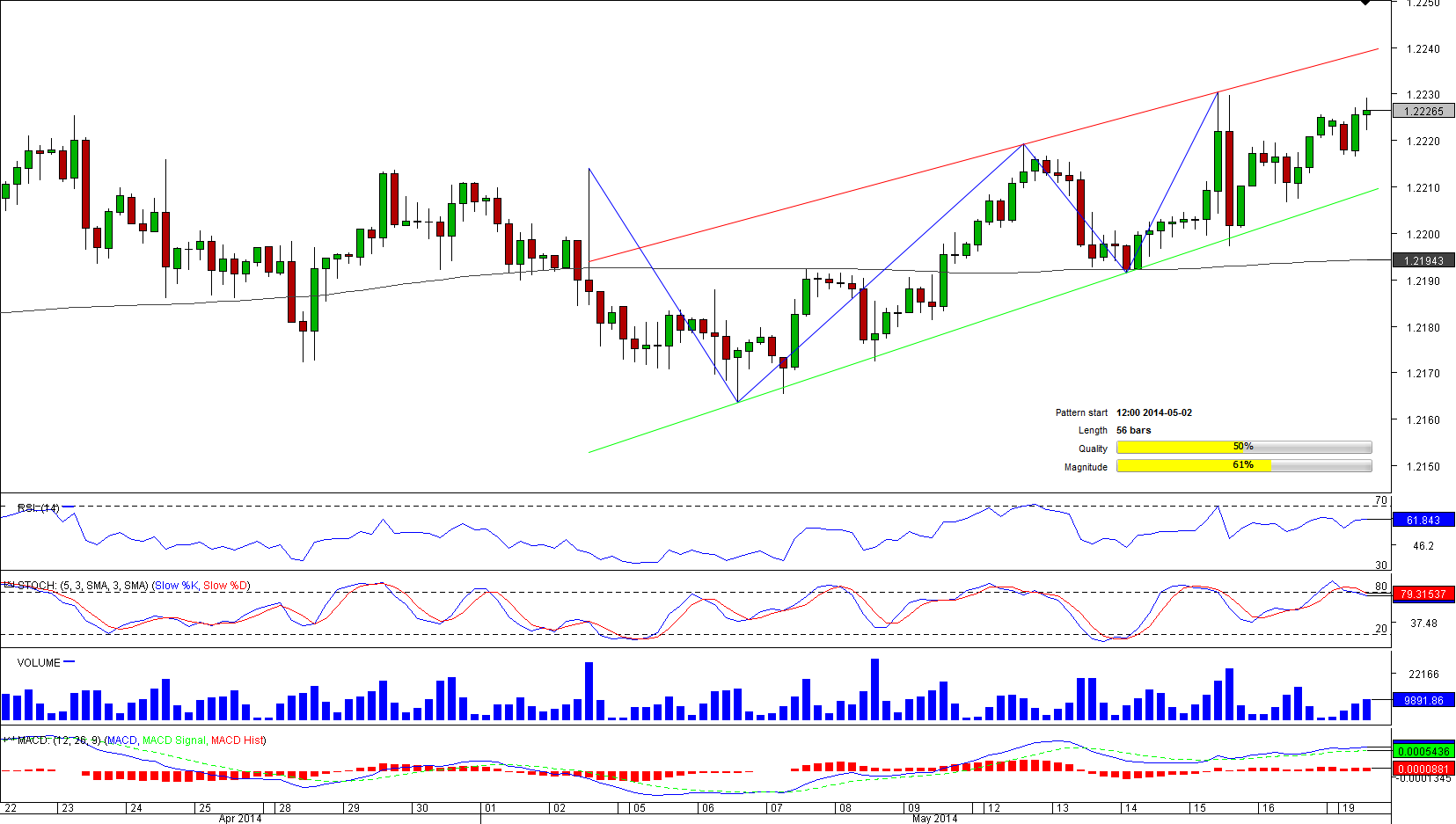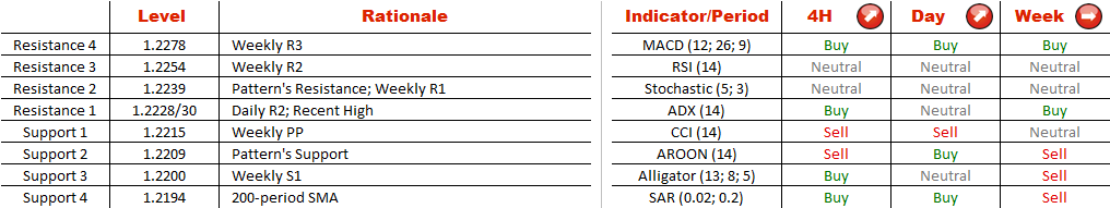 It is a well-known fact that the Swiss Franc is pegged to the single currency. Therefore, pair's movement is limited by the pegged imposed by the SNB in 2011. Nevertheless, the pair can appreciate with no risks of intervention, and according to aggregate technical indicators on the 4H and daily charts, the movement to the north will continue. Furthermore, 73% of opened positions are long and recently, traders have turned more positive on the single currency in general. Taking it all into account, the outlook for the pair is bullish, with the first target for the long traders being located at 1.2230, while the next stop is weekly R1 and pattern's resistance at 1.2239.
