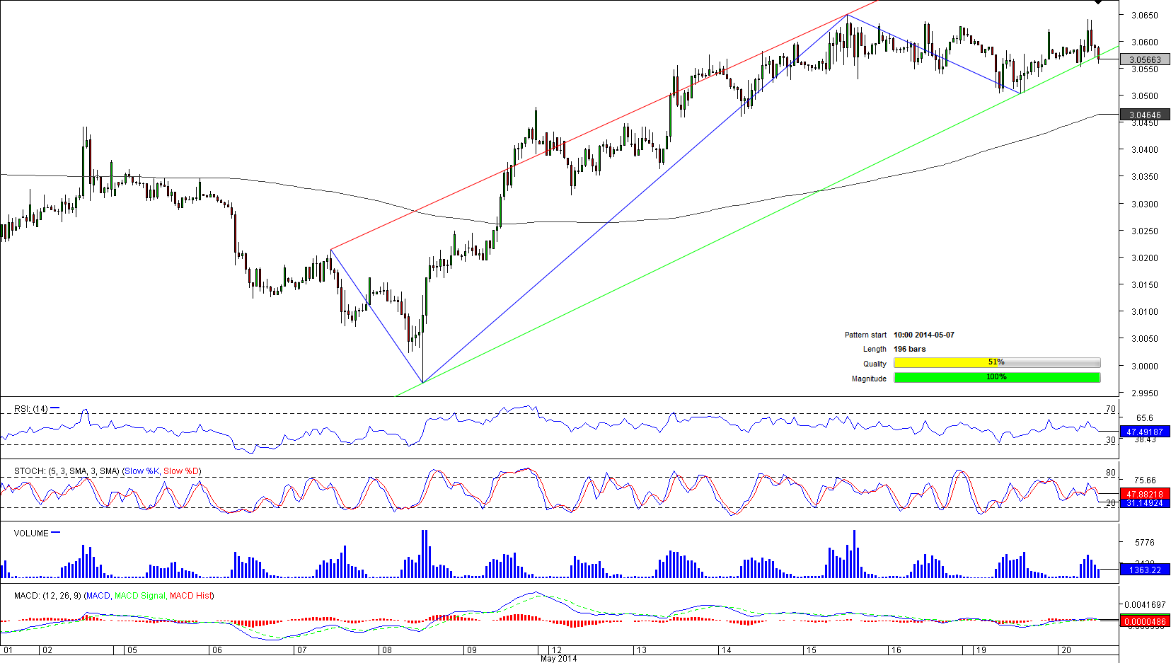 The U.S. currency is finally recovering. At least versus the Polish Zloty. The USD/PLN pair has been moving higher since May 8, when the pair moved below 3.00-mark. At the moment of writing the pair has been changing hands around the pattern's support line. However, keeping in mind 'buy' signals from technicals on the hourly and daily chart, the penetration of the lower boundary seems unlikely. Despite extremely positive attitude towards the greenback, more than 72% of all opened positions is short, suggesting traders consider the pair is overbought. It will be also worth mentioning that MACD on the hourly and 4H chart is sending ‘sell' signals.