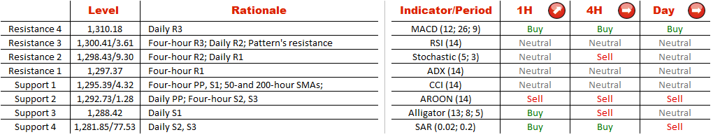 Currently, the bullion is sitting slightly above the 50-and 200-hour SMAs at 1,295.37. In the hours to come, the most traded precious metal may bounce off this level and follow a distinct bullish trend given that over 70% of positions on the SWFX are long. On its way towards the upper limit of the formation, XAU/USD will face several hurdles, namely 1,297.37/9.30 (four-hour R1, R2; daily R1) and 1,300.41/3.61 (four-hour R3; daily R3) that may limit the forthcoming upswing.