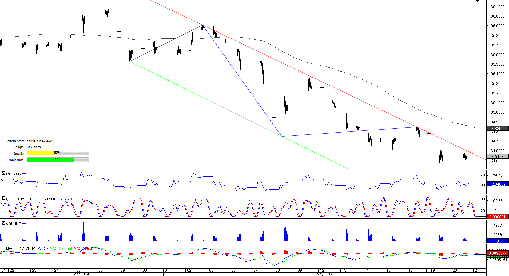 At the moment, the pair is sitting not far away from the upper boundary of the tunnel. However, USD/RUB is likely to retreat from the pattern's resistance in the foreseeable future taking into account the SWFX sentiment-more than 67% of traders are bearish. If this comes true, the pair may dive to 34.4722/027 (daily S1, S2) and then to 34.3094 (daily S3); below the latter level USD/RUB is likely to commence an accelerating decline towards the lower limit of the formation.